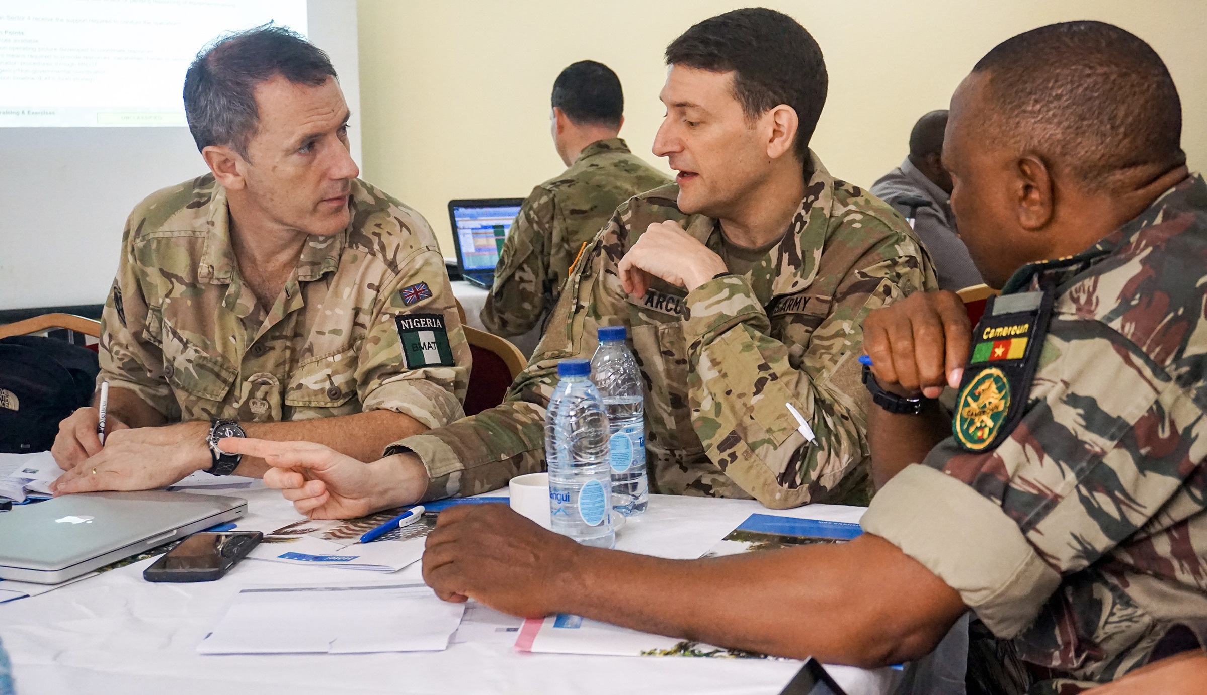 Planners discuss the details of exercise scenarios during the Unified Focus 2017 final planning event in Douala, Cameroon, on Feb. 6, 2016. The planning event brought partner nation planners together to discuss and shape the inaugural Unified Focus exercise designed to enhance and enable Lake Chad Basin Commission nations to support the Multinational Joint Task Force counter-Boko Haram operations.