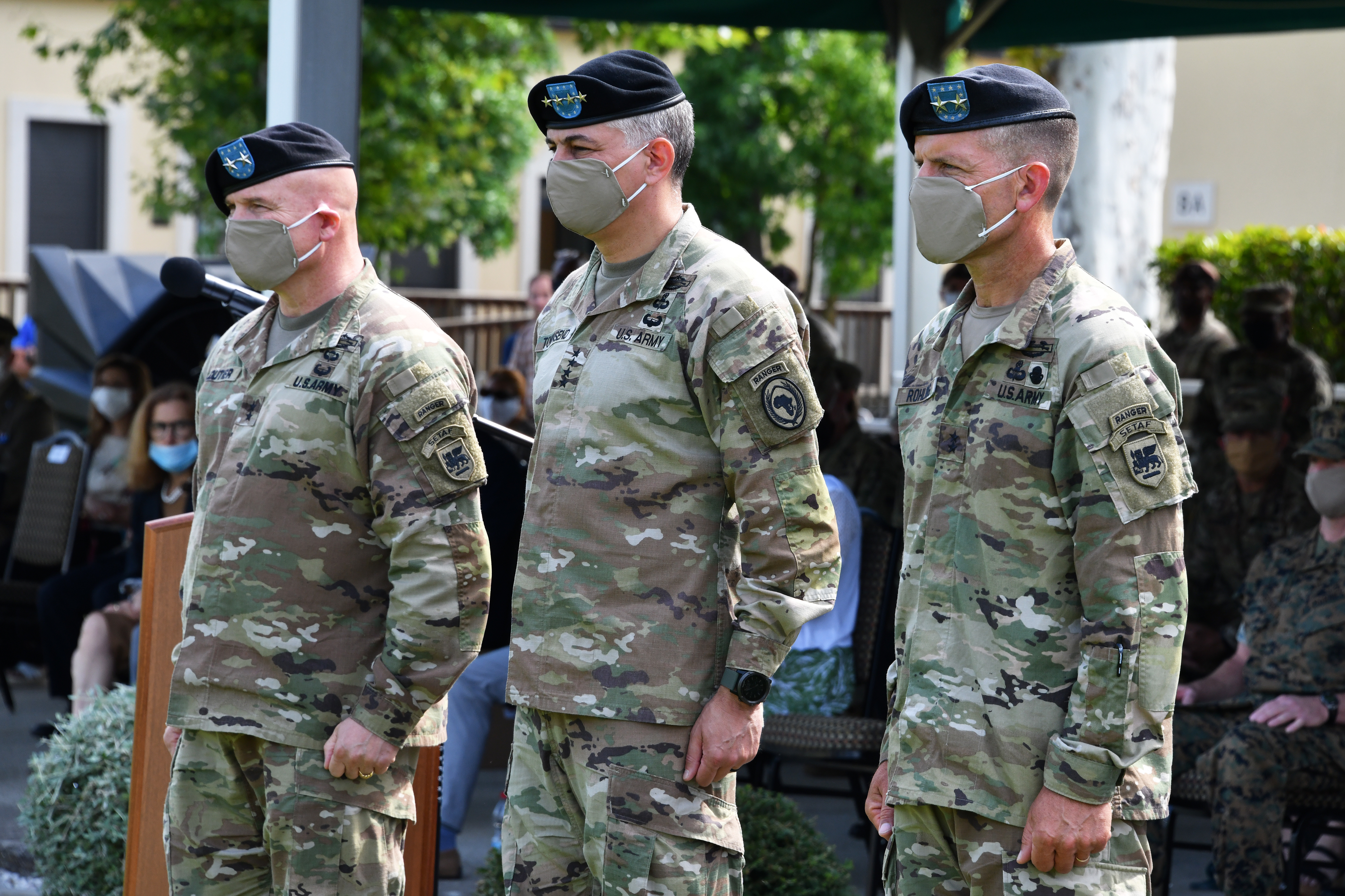 From left, Maj. Gen. Roger L. Cloutier, the outgoing U.S. Army Africa commanding general, Gen. Stephen Townsend, commander, U.S Africa Command, and Maj. Gen. Andrew M. Rohling, the incoming USARAF commanding general, attend the change of command ceremony held at Caserma Ederle in Vicenza, Italy, July 15, 2020.