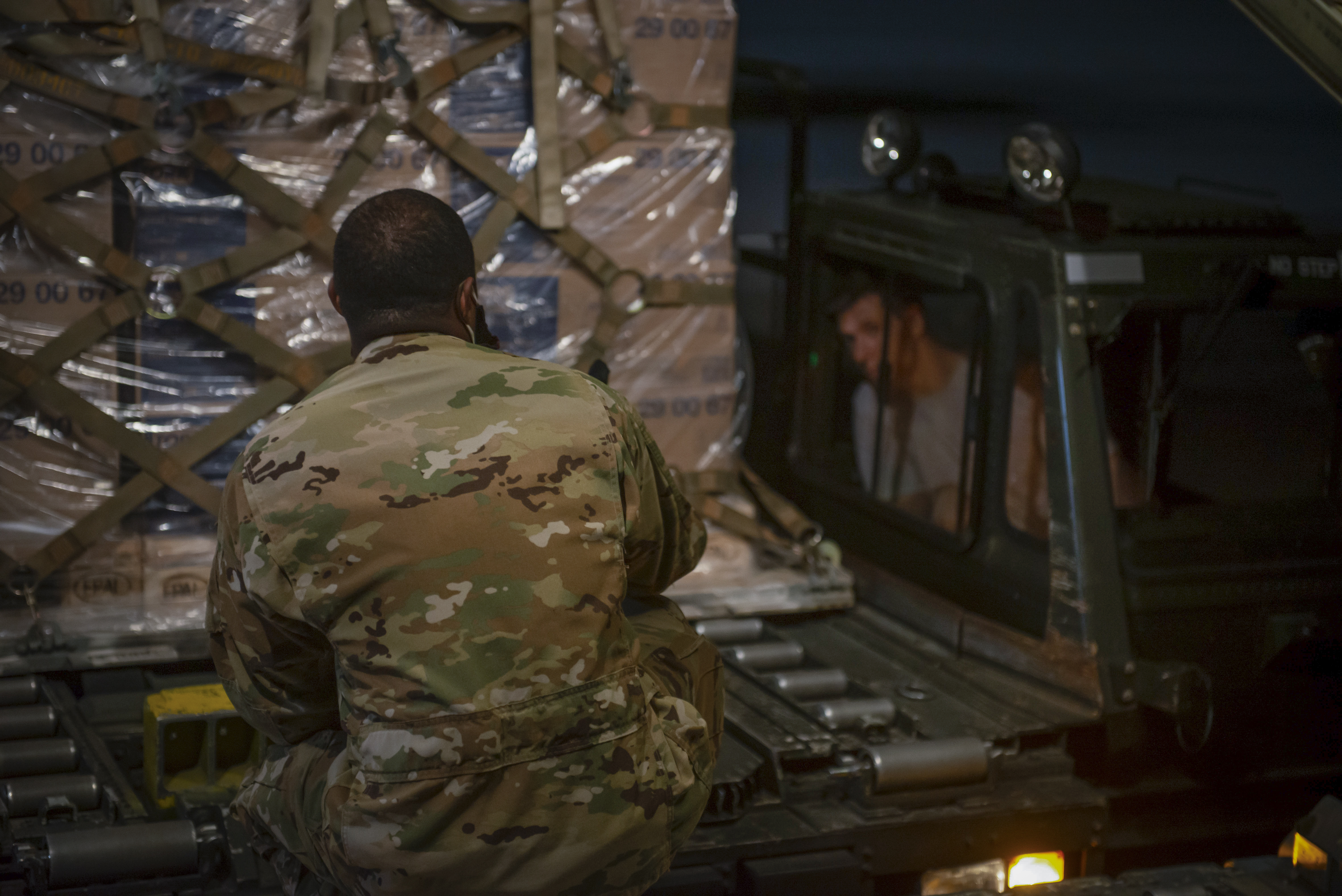 U.S. Air Force Staff Sgt. Brian Clark, 37th Airlift Squadron loadmaster, guides COVID-19 personal protection equipment onto a C-130J Super Hercules at Ramstein Air Base, Germany, Aug. 13, 2020. The medical supplies will be taken to South Africa to assist with COVID-19 relief efforts. U.S. Africa Command sourced the $300k worth of personal protection equipment. (U.S. Air Force Photo by Staff Sgt. Jourdan Barrons)