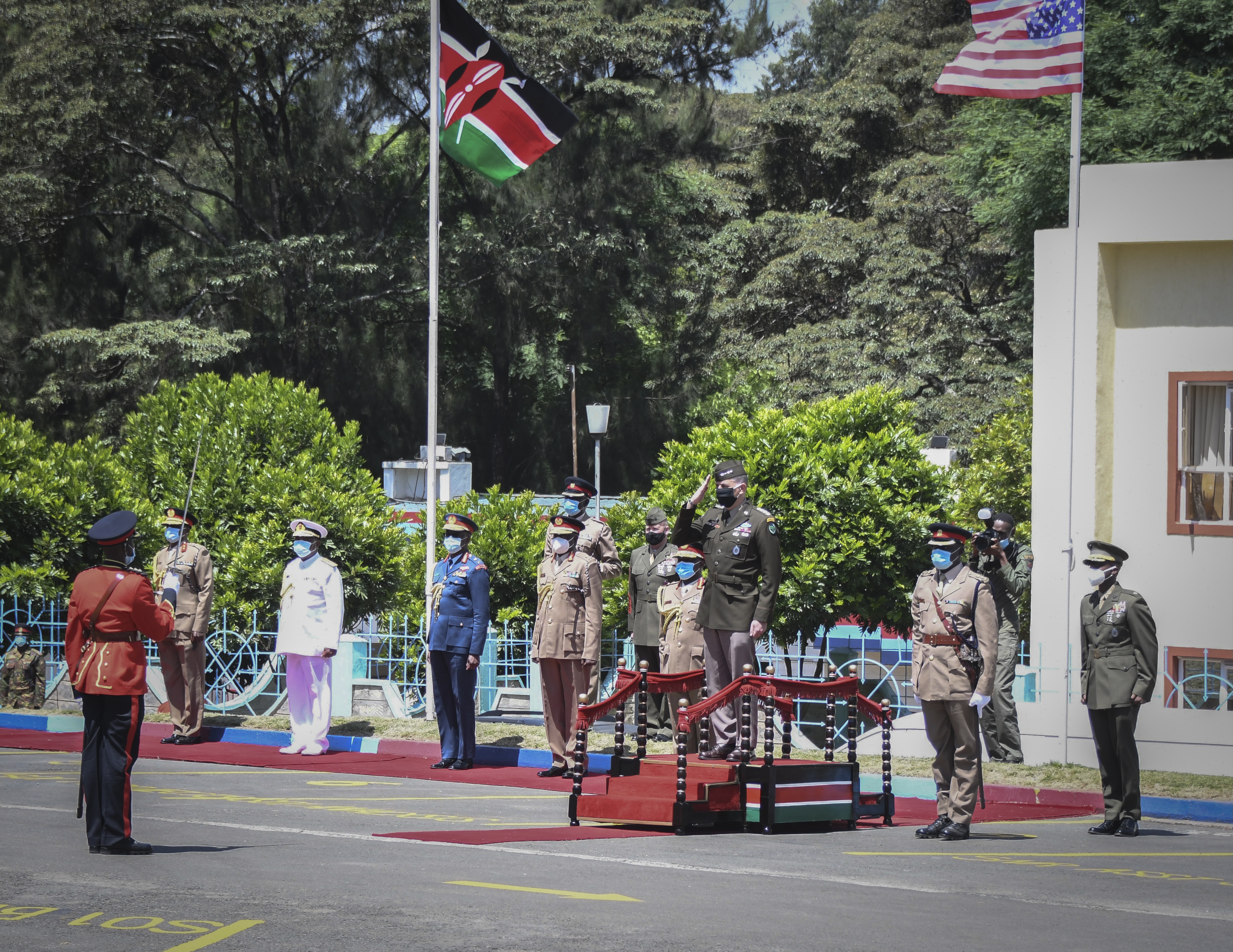 U.S. Army Gen. Stephen Townsend, commander, U.S. Africa Command, stands with senior Kenyan Defence Forces leadership prior to conducting a pass and review of KDF Soldiers Dec. 15. Townsend and Sgt. Maj. Richard Thresher, command senior enlisted leader, U.S. Africa Command, conducted a four-day trip to Kenya and Djibouti to conduct strategic engagements with partner nation leadership, assess operations and security of U.S. force locations, and demonstrate continued commitment to working with African partners.