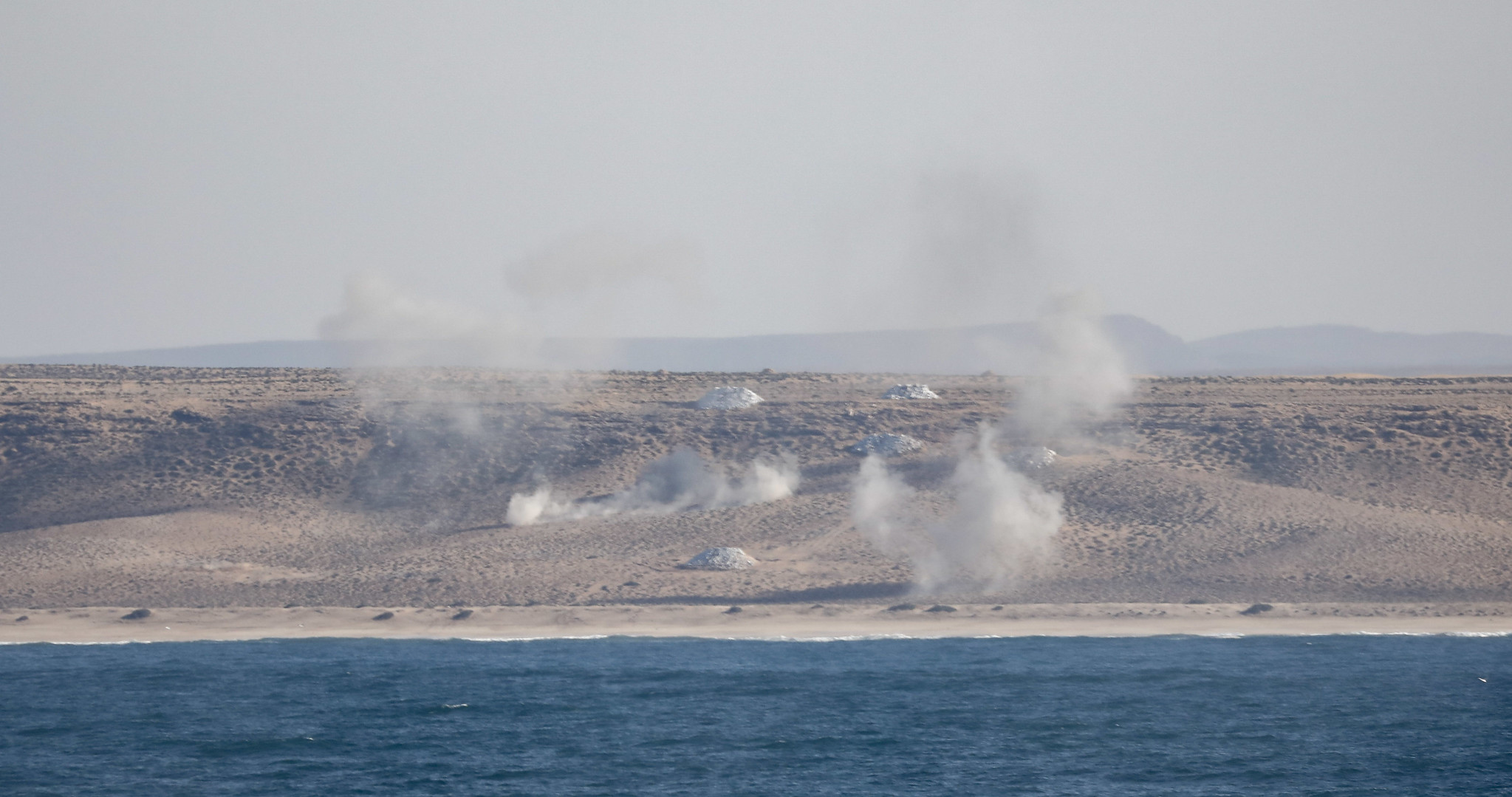 210115-N-BM428-0366 ATLANTIC OCEAN (Jan. 15, 2021) Rounds fired from the Arleigh Burke-class guided-missile destroyer USS Porter’s (DDG 78) Mark 45 5-inch gun make impact on the Aourioura Ordnance Range near Tan Tan, off the coast of Morocco, during a live-fire exercise portion of Exercise Atlas Handshake, Jan 15, 2021. Porter, forward deployed to Rota, Spain, is on its ninth patrol in the U.S. 6th fleet area of operations in support of U.S. national security interests in Europe and Africa. (U.S. Navy photo by Mass Communication Specialist 2nd Class Damon Grosvenor