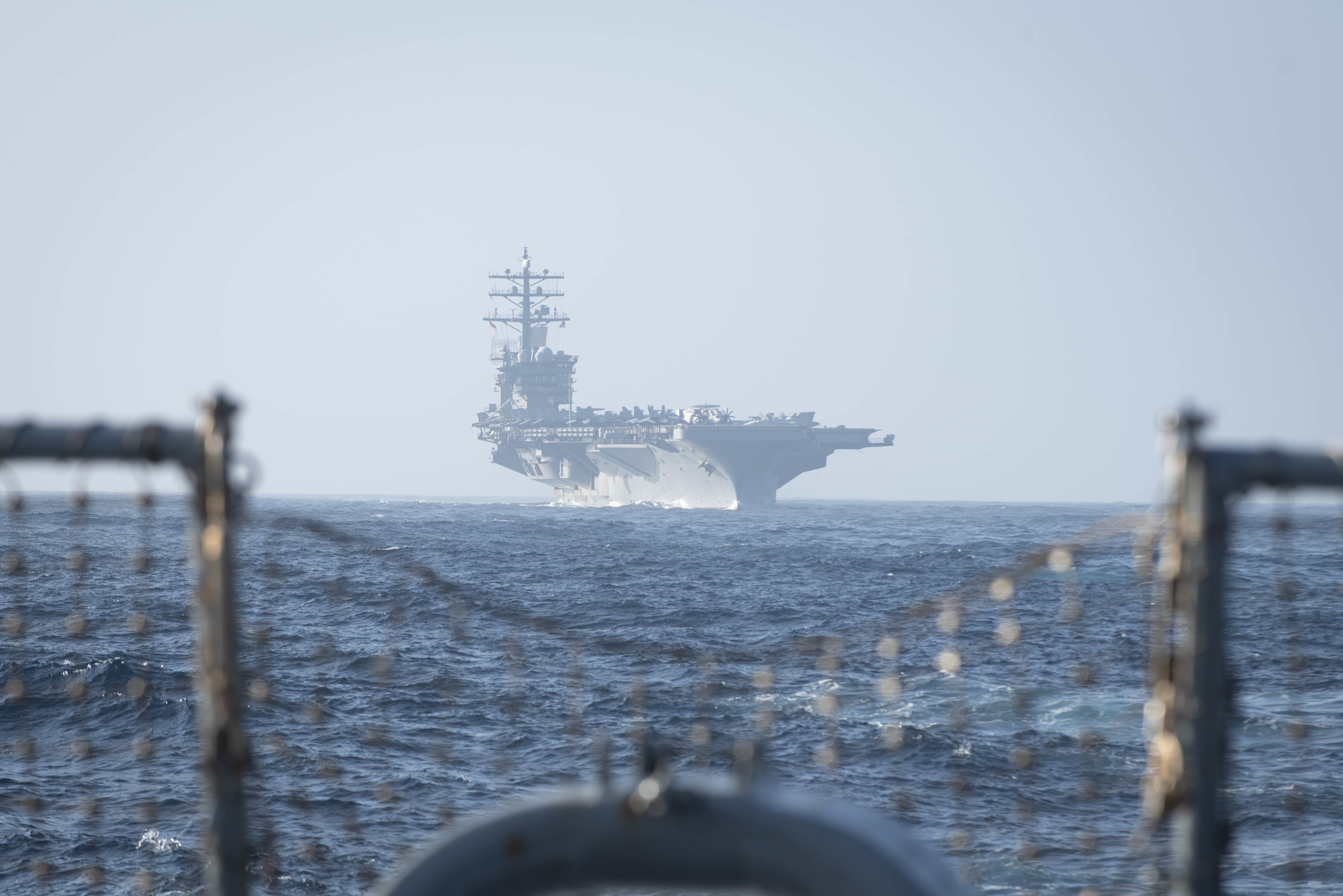 The Nimitz-class aircraft carrier USS Dwight D. Eisenhower (CVN 69) sails behind the Arleigh Burke-class guided-missile destroyer USS Mitscher (DDG 57), March 3, 2021. The USS Dwight D. Eisenhower Carrier Strike Group is participating in Lightning Handshake, a bi-lateral maritime exercise between the U.S. and the Royal Moroccan Navy (RMN) and Royal Moroccan Air Force (RMAF).