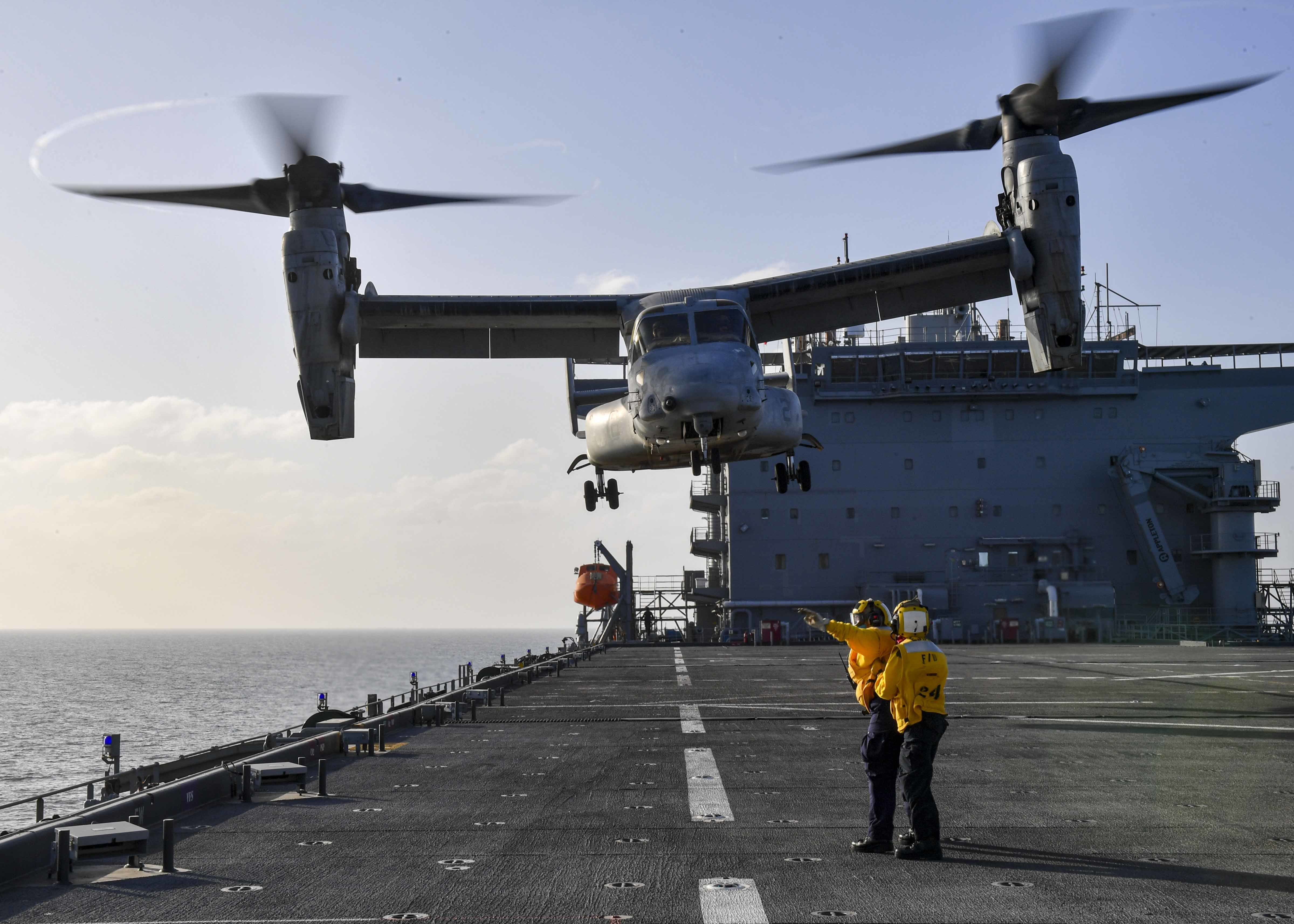 Sailors lift a U.S. Marine Corps MV-22 Osprey from the North and West Africa Response Force Aviation Combat Element from the Expeditionary Sea Base Hershel “Woody” Williams operating off the Horn of Africa, Jan. 30, 2021. The NARF stands ready to respond to crisis response missions in Africa.