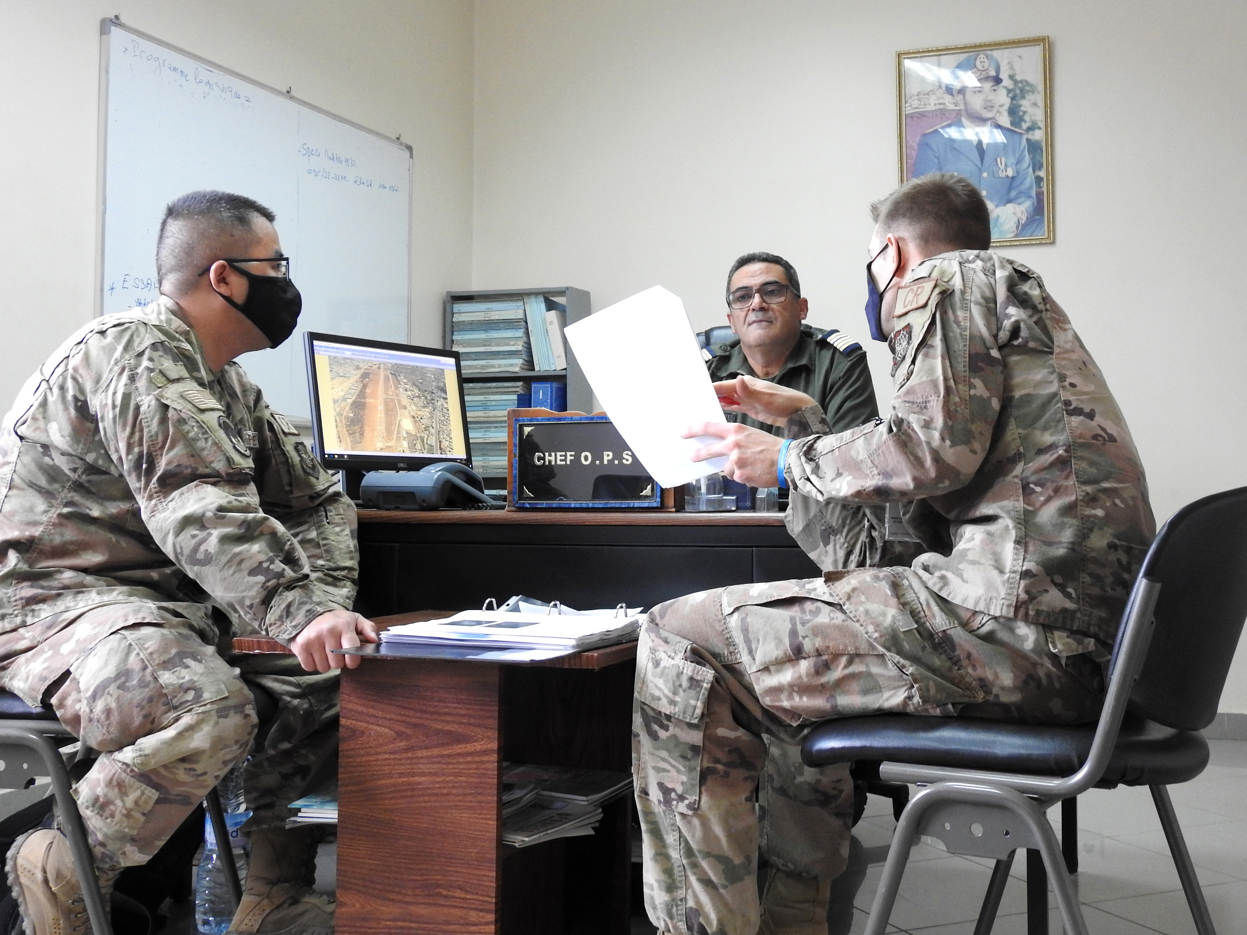 Capt. Jack Robinson, 821st Contingency Response Support Squadron airfield assessment team chief and civil engineer, right, and Capt. Andrew Senko, 821st Contingency Response Squadron airfield assessment civil engineer, left, discuss airfield structural capabilities with Col. Mohammed Tourabi, Royal Moroccan Air Force, center, at the Inezgane Airport, Morocco, April 24, 2021. The members, assigned to an airfield survey team, were tasked to survey five airfields across Morocco to determine their suitability to receive mobility aircraft. (courtesy photo)