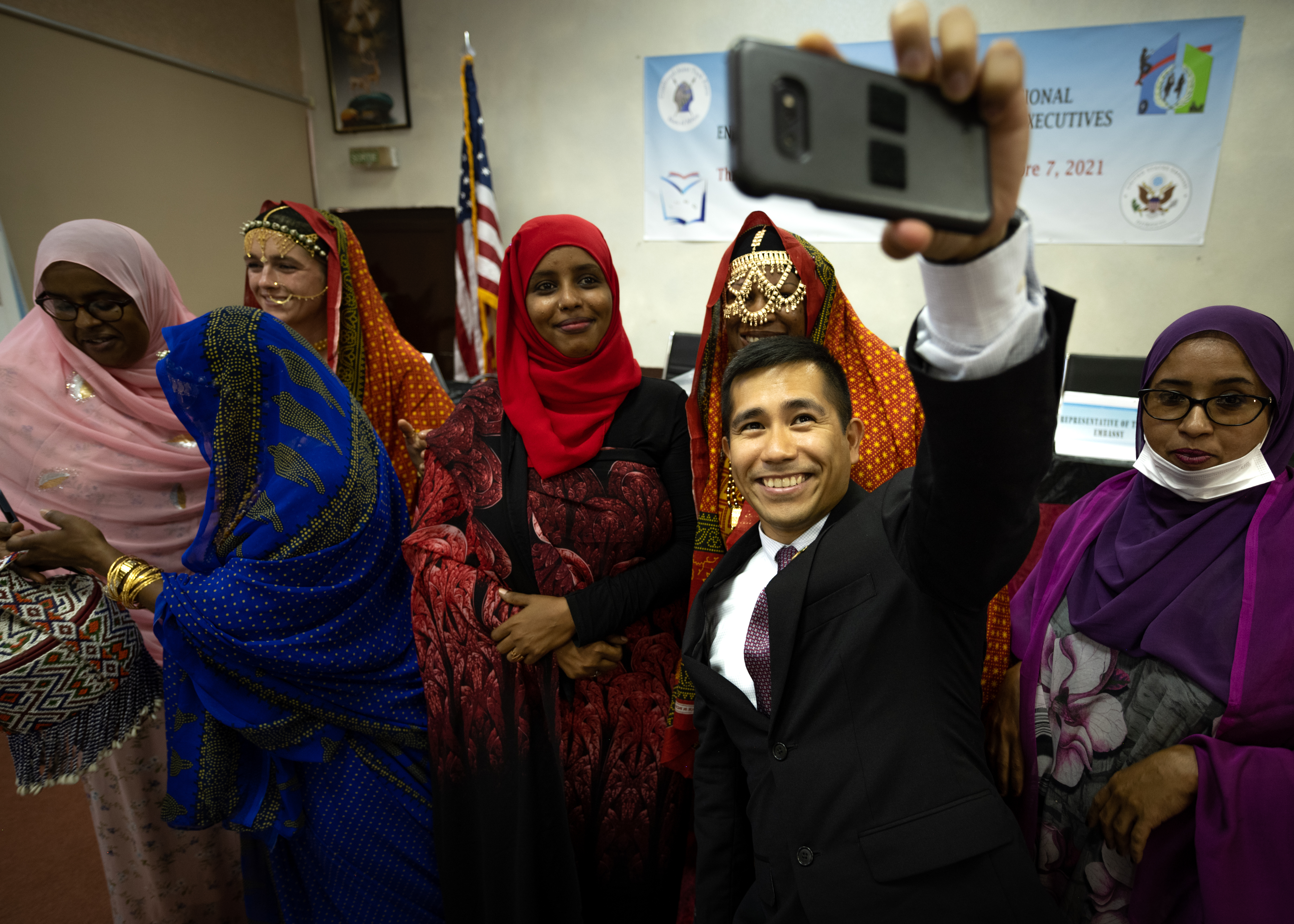 U.S. Army Capt. Khrisian Lopez, 404th Civil Affairs Battalion (Airborne), Civil Affairs East Africa, takes a selfie with U.S. and Djiboutian participants during a celebration at the National Institute of Public Administration training center in Djibouti City, Djibouti, Oct. 13, 2021. Twenty-five Djiboutians completed an English Discussion Course which aimed to increase the participants' confidence and competency in the English language to further business opportunities for all of Djibouti. (U.S. Air Force photo by Senior Airman Andrew Kobialka)