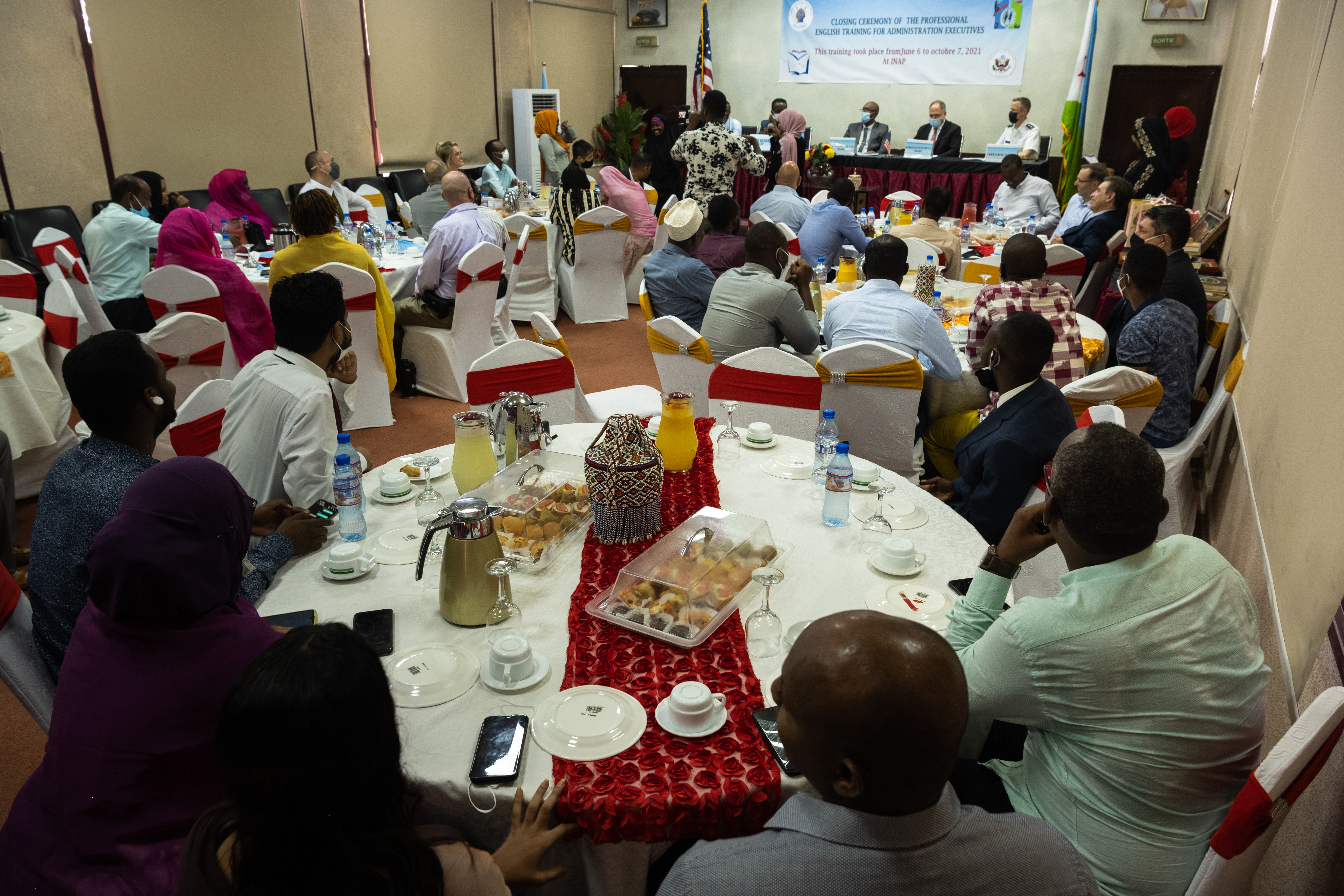 The Combined Joint Task Force-Horn of Africa commanding general, Djibouti Minister of Labor, and a representative from the U.S. Embassy join participants and facilitators of the 3-month, U.S.-led English Discussion Group at the National Institute of Public Administration training center in Djibouti City, Djibouti, Oct. 13, 2021. Twenty-five Djiboutians completed the course which aimed to increase the participants' confidence and competency in the English language to further business opportunities for all of Djibouti. (U.S. Air Force photo by Senior Airman Andrew Kobialka)