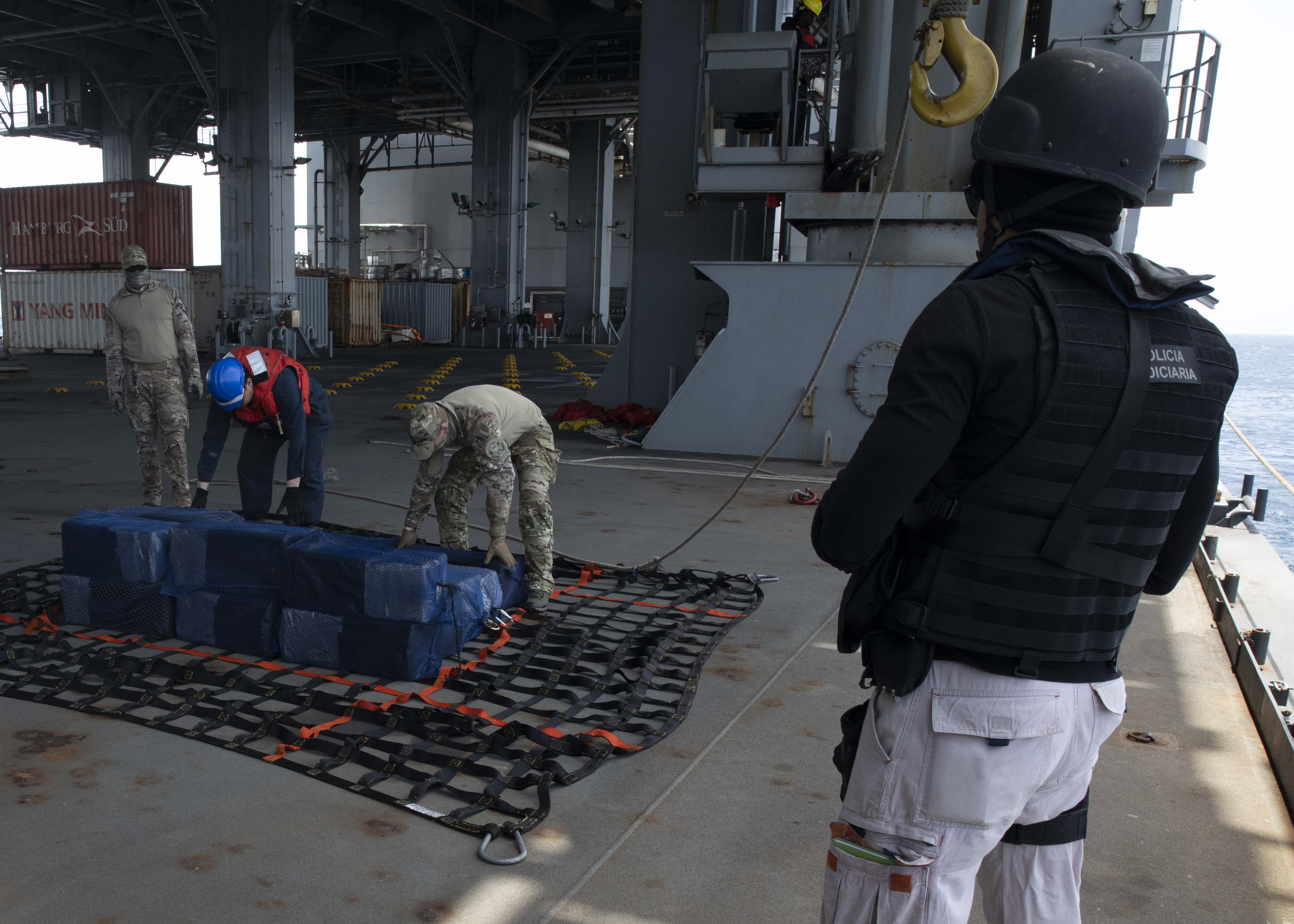 A Judicial Police officer from Cabo Verde, monitors a Sailor, and U.S. Coast Guardsmen assigned to the Expeditionary Sea Base USS Hershel "Woody" Williams (ESB 4), prepare seized contraband for offload to the Cabo Verdean authorities, April 6, 2022. Hershel "Woody" Williams is on a scheduled deployment in the U.S. Sixth Fleet area of operations in support of U.S. national interests and security in Europe and Africa.