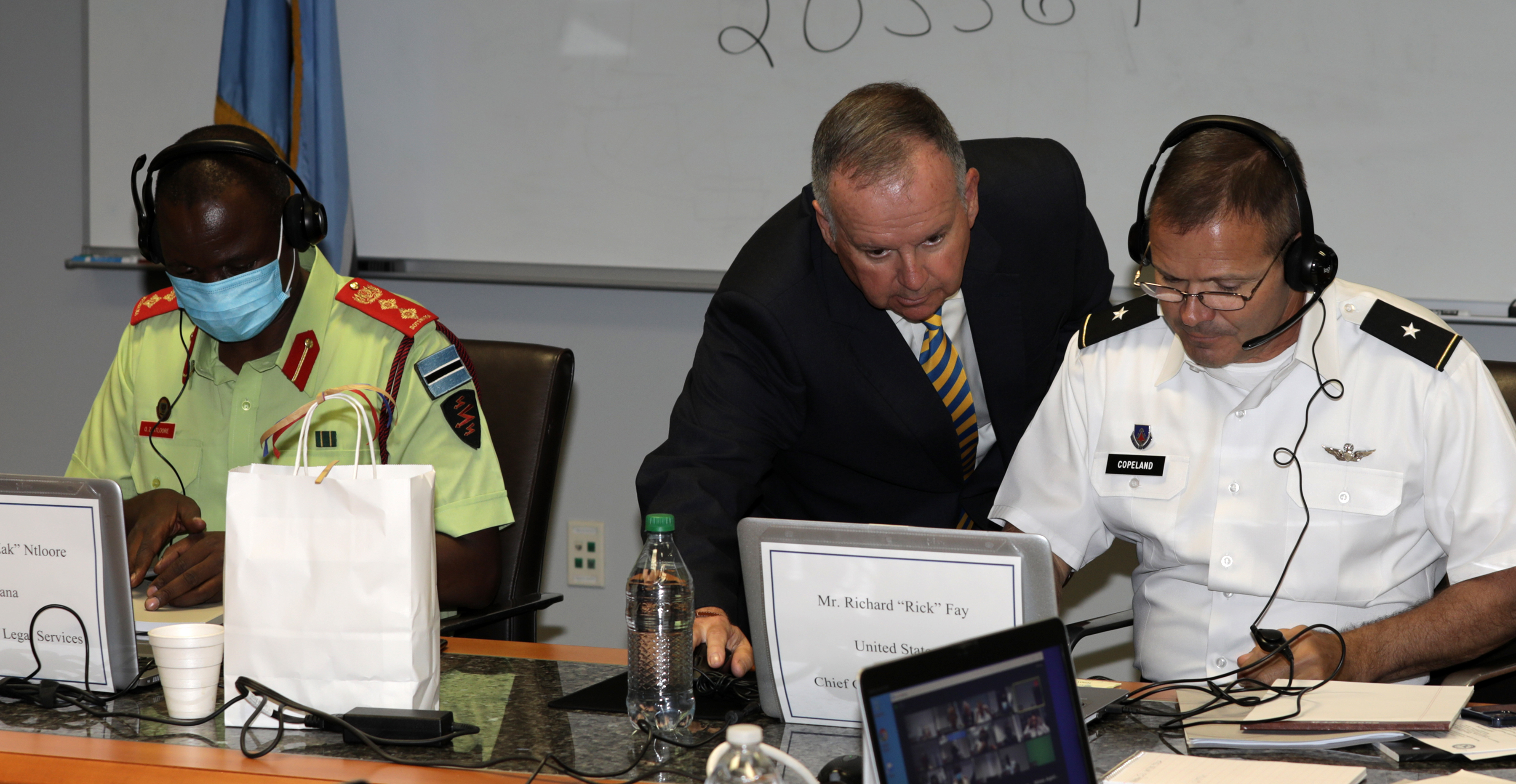 North Carolina National Guard leader U.S. Army Brig. Gen. Jeffery Copeland, the NCNG Director of Joint Staff, right, and retired Col. Rick Fay, NCNG Chief Counsel, listen to legal experts via translators at the African Military Law Forum Advisory Council at NCNG Joint Force Headquarters in Raleigh, North Carolina, April 26 - 28, 2022. The conference, created by the United States Africa Command, brought African military legal advisors from several nations including Botswana, one of the NCNG State Partnership Program peers, and Nigeria, Cameroon, Namibia, Burkina Faso, Uganda, Tunisia, Niger, Malawi, Burundi, and NCNG leaders to share their expertise in International, Operational, Administrative, and Civil law and to announce the formation of the Women’s Peace and Security component to the ongoing forum.