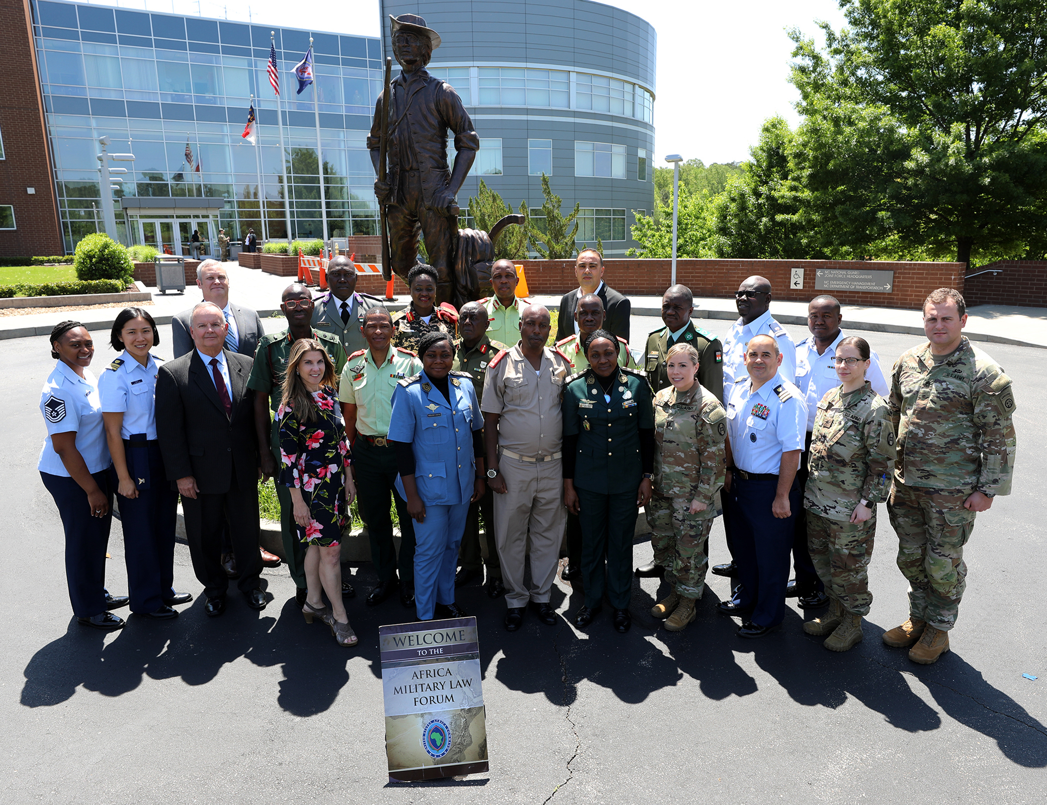 Members of the African Military Law Forum Advisory Council pose at the North Carolina National Guard hosted at NCNG Joint Force Headquarters in Raleigh, North Carolina, April 26 - 28, 2022. The conference, created by the United States Africa Command, brought African military legal advisors from several nations including Botswana, one of the NCNG State Partnership Program peers, and Nigeria, Cameroon, Namibia, Burkina Faso, Uganda, Tunisia, Niger, Malawi, Burundi, and NCNG leaders including U.S. Army Brig. Gen. Jeffery Copeland, the NCNG Director of Joint Staff and retired Col. Rick Fay, NCNG Chief Counsel, to share their expertise in International, Operational, Administrative, and Civil law and to announce the formation of the Women’s Peace and Security component to the ongoing forum.