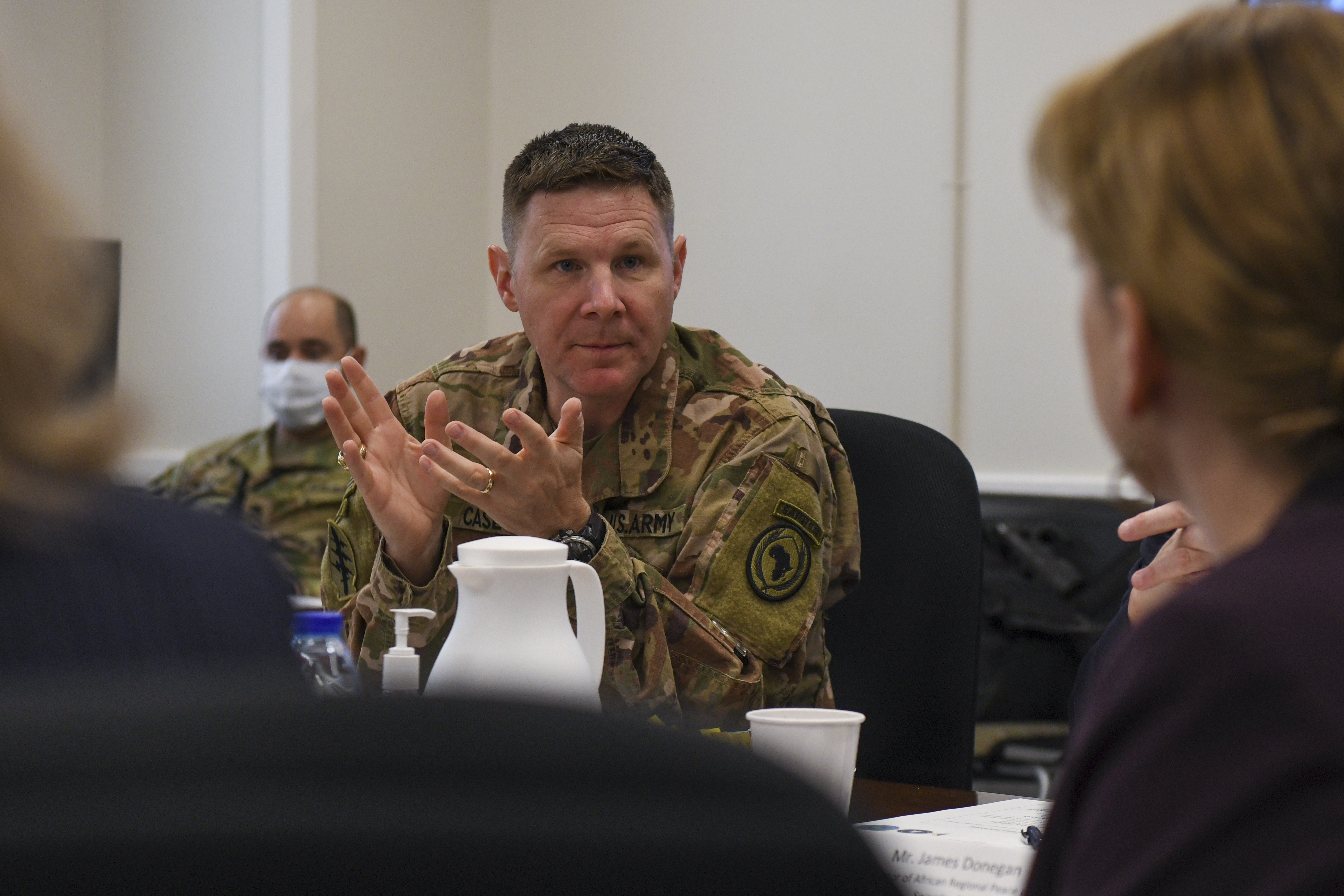 U.S. Brig. Gen. Stephen Case, deputy commanding general of Combined Joint Task Force – Horn of Africa, speaks with Department of State officials during the 2022 East Africa Security Forum at Camp Lemonnier, Djibouti, May 11, 2022.