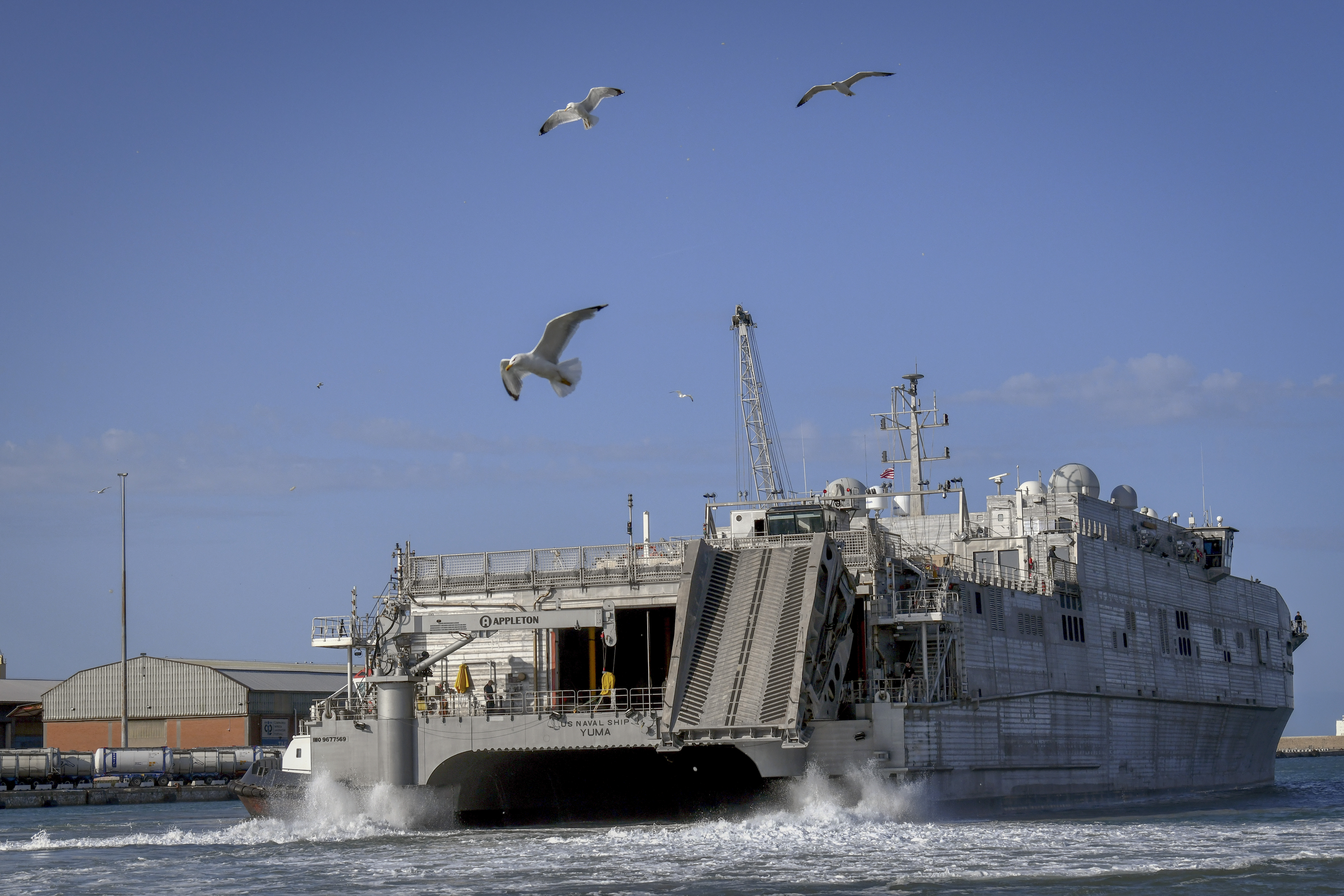 The Military Sealift Command Vessel USNS Yuma enters Livorno port to transport equipment from locations across Europe to Agadir, Morocco, as part of exercise African Lion 22.