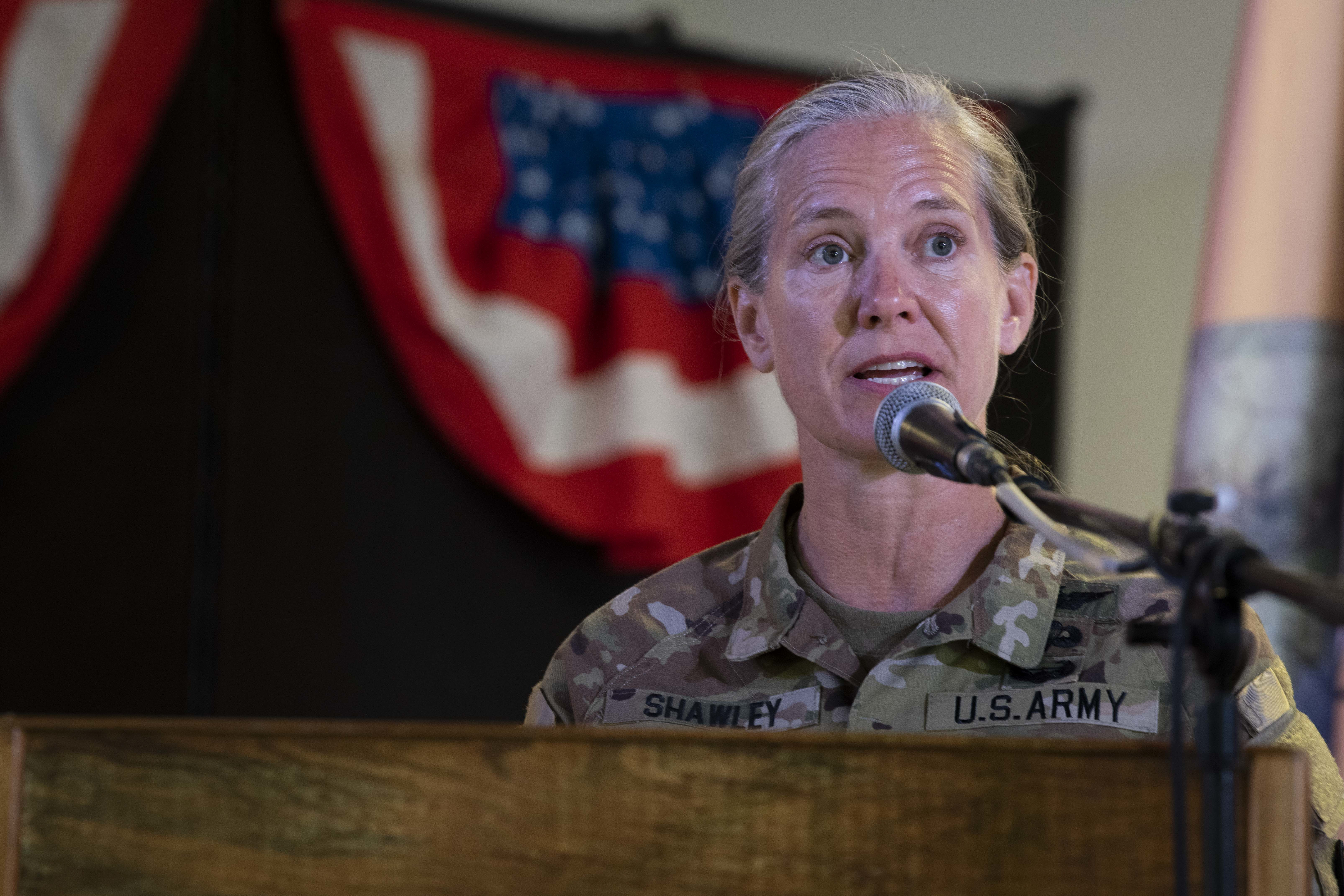 U.S. Army Maj. Gen. Jami Shawley, commander of the Combined Joint Task Force – Horn of Africa (CJTF-HOA), delivers comments during a change of command ceremony at Camp Lemonnier, Djibouti, May 14, 2022. As a dynamic, joint and multinational operational headquarters, CJTF-HOA ensures a strategic partnership with Djibouti, responds to crises, supports operations, protects U.S. lives and enables the countering of violent extremist organizations throughout East Africa in order to enhance stability and prosperity. (U.S. Air Force photo by Tech. Sgt. Lynette M. Rolen)