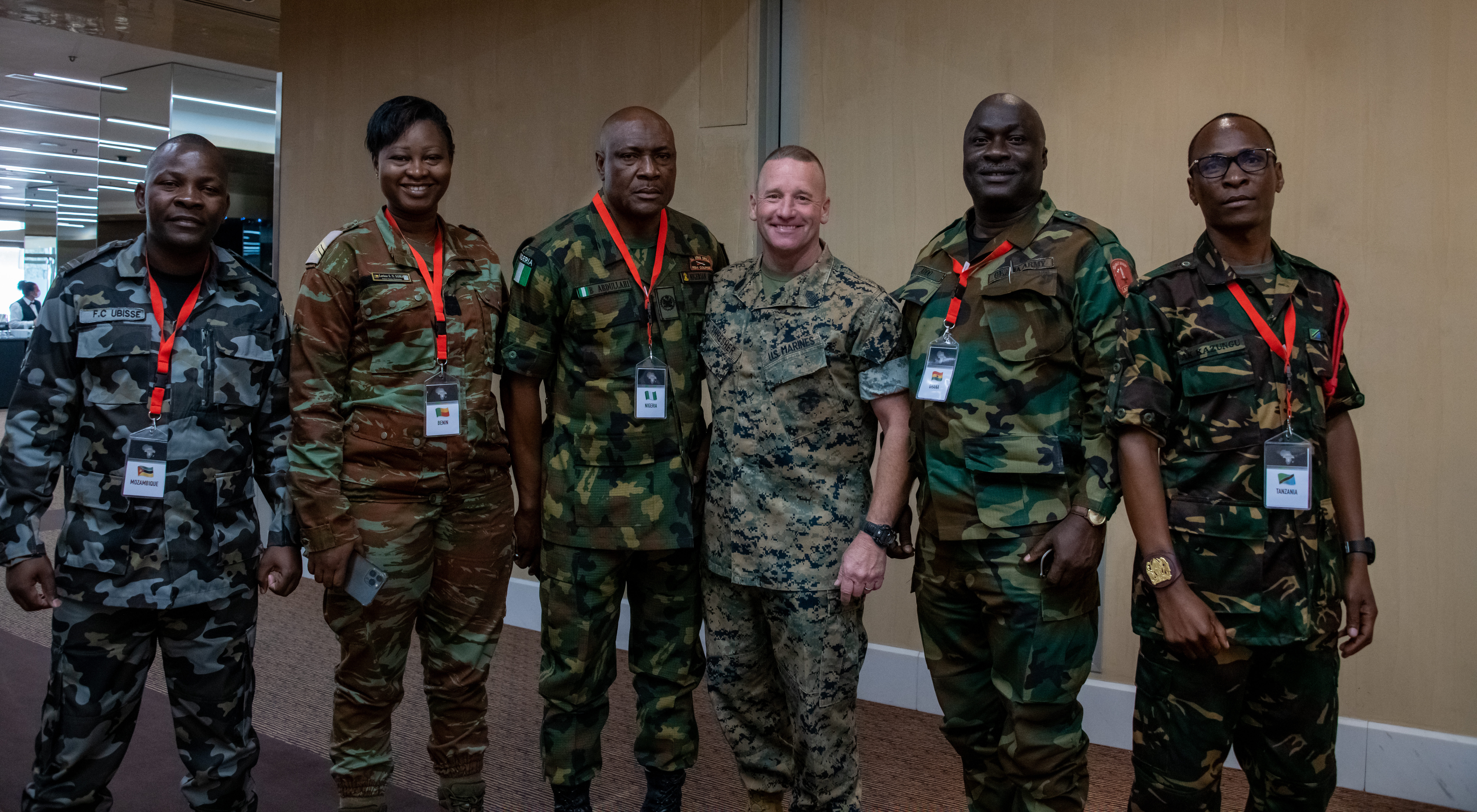 U.S. Marine Corps Sgt. Maj. Richard Thresher, command senior enlisted leader, U.S. Africa Command, poses with African partners during the Africa Senior Enlisted Leader Conference in Rome, Italy, from Aug. 22-23. The conference serves as a venue for all participating nations to collaborate with and learn from each other while discussing key challenges faced across the continent and avenues to discuss how we can best work together to address those challenges.