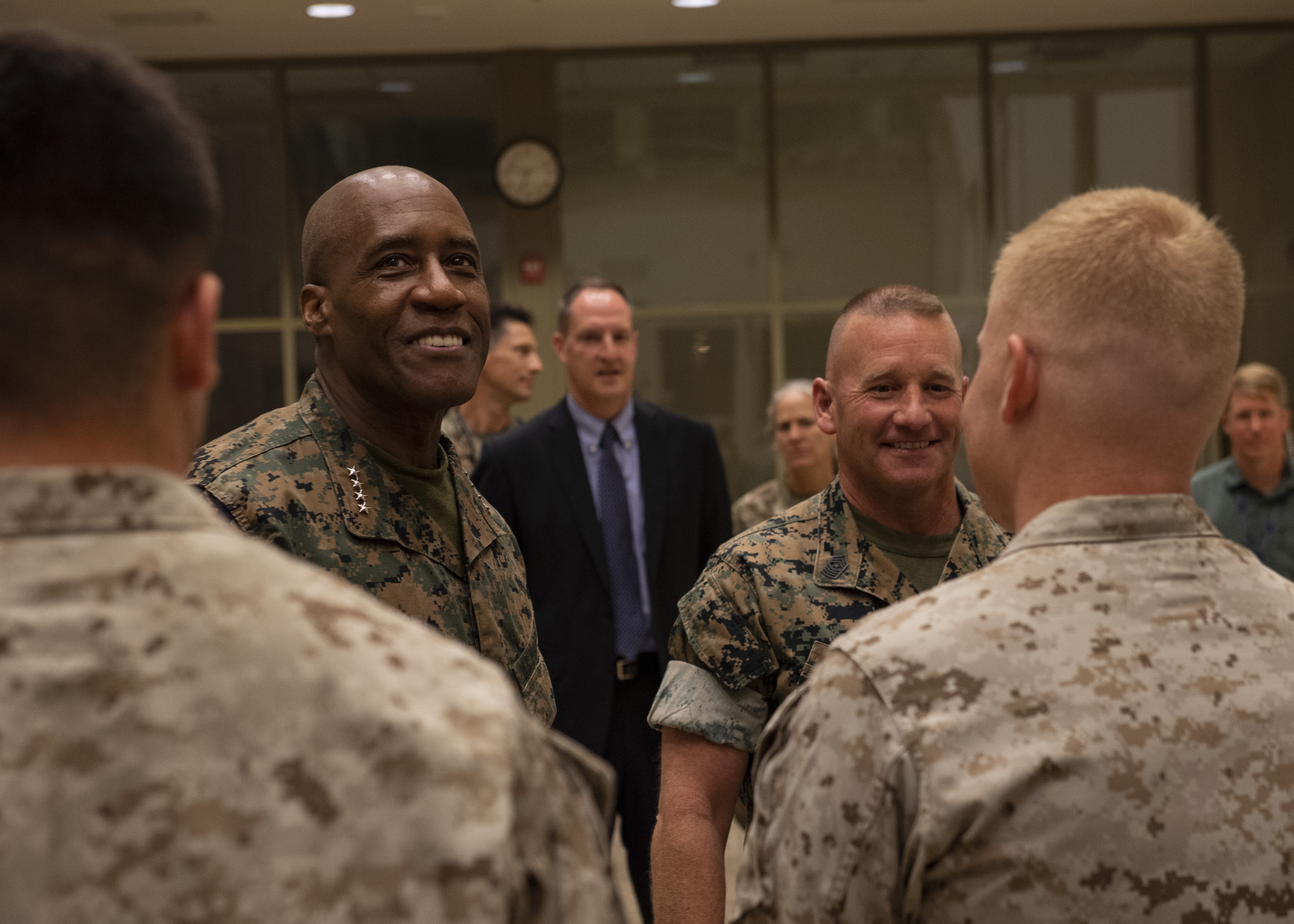 U.S. Marine Corps Gen. Michael Langley, commander, U.S. Africa Command, and Sgt. Maj. Richard Thresher, command senior enlisted leader, U.S. Africa Command, speak with Sgt. Jeffrey Powell, Marine Security Guard Detachment Djibouti, Aug. 28, 2022, as part of a troop engagement for Langley’s first visit to Africa as U.S. Africa Command’s commanding general. The visit came as part of a four-day trip to Djibouti, Somalia, and Manda Bay, Kenya, from August 28-31, 2022, to meet with host nation leaders, senior interagency officials, and deployed troops to better understand the political and military situation in East Africa, discuss shared concerns and priorities, and see ongoing operations firsthand.