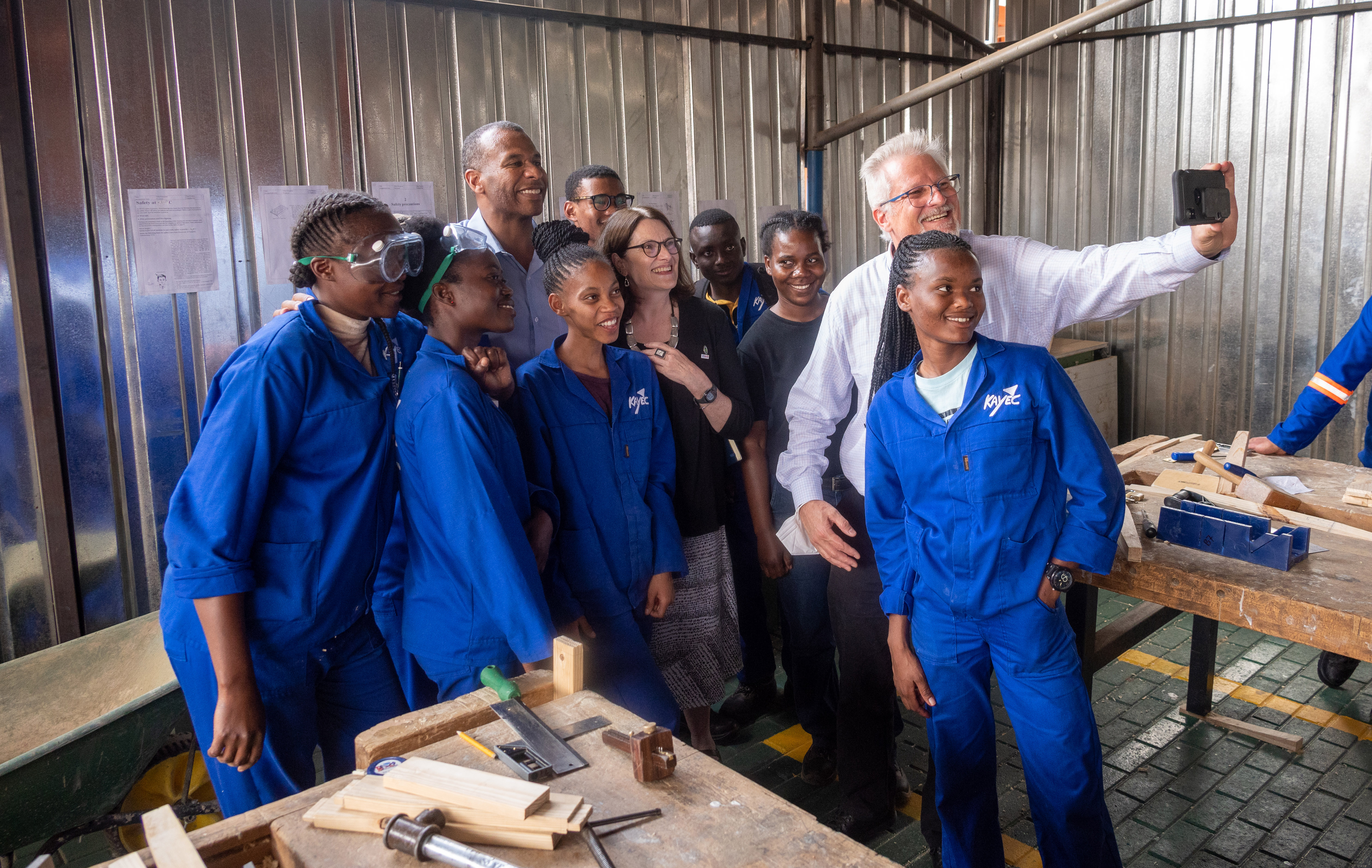 Amb. Andrew Young, U.S. Africa Command deputy to the commander for civil-military engagement, Ms. Barbara Hughes, USAID senior development advisor to U.S. Africa Command, and U.S. Air Force Brig. Gen. Peter Bailey, U.S. Africa Command deputy director for Strategy, Engagement and Programs, take a selfie with members of the DREAMS Initiative during a visit to Windhoek, Namibia, on Aug. 30, 2022. The DREAMS (Determined, Resilient, Empowered, AIDS-free, Mentored, and Safe) Initiative seeks to reduce HIV infection among adolescence girls and young women, funded by the U.S. President’s Emergency Plan for AIDS Relief program.