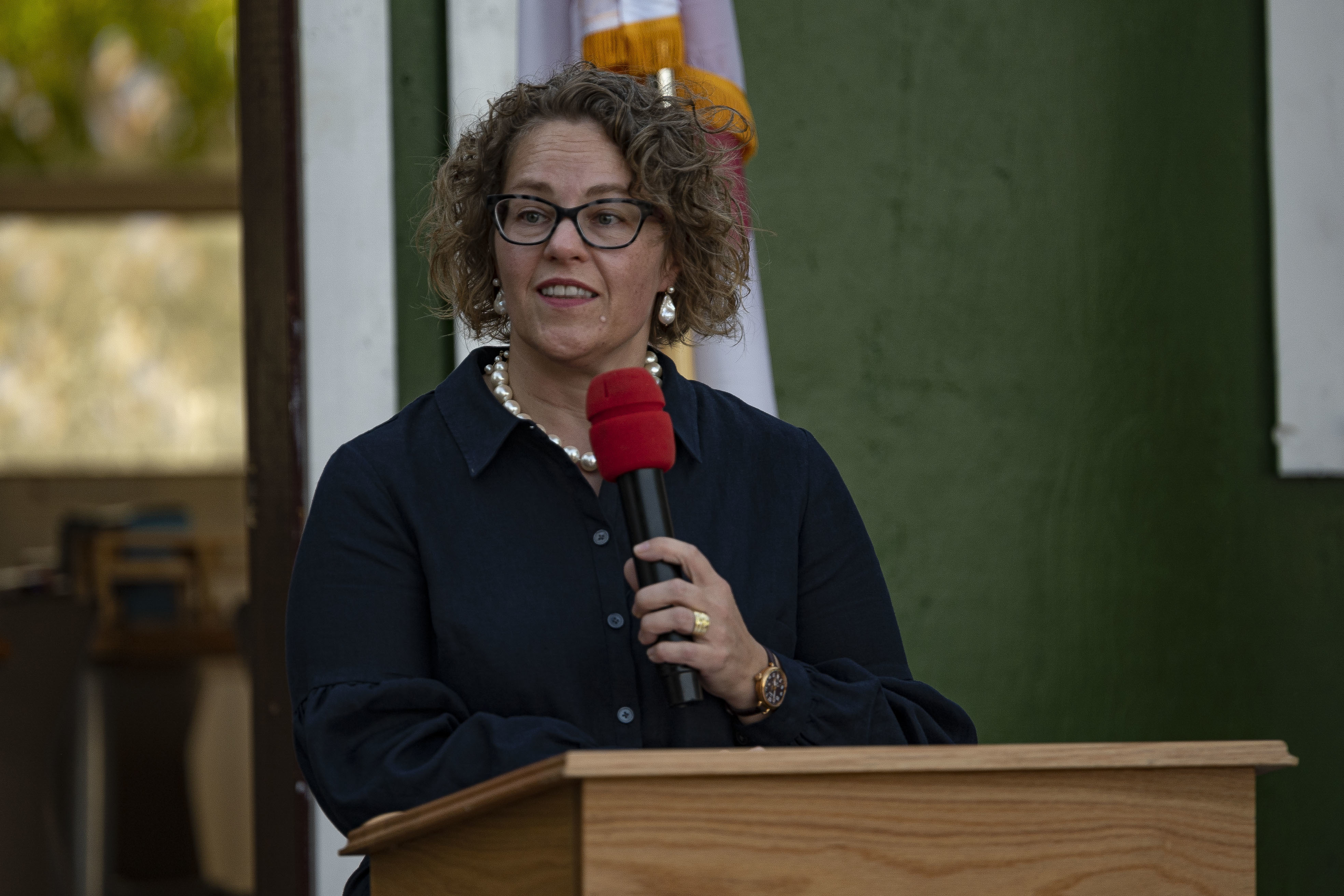 Andrea Tomaszewicz, U.S. Embassy Djibouti Deputy Chief of Mission, speaks during an opening ceremony for a Library at the Balbala 7 School in Balbala, Djibouti, Oct. 4, 2022. The project took four weeks to complete, with the 319th Engineer Support Company, assigned to CJTF-HOA, building the structure, Spanish military members providing books and reading materials, and the Japanese and Italian military members providing furniture for the interior.