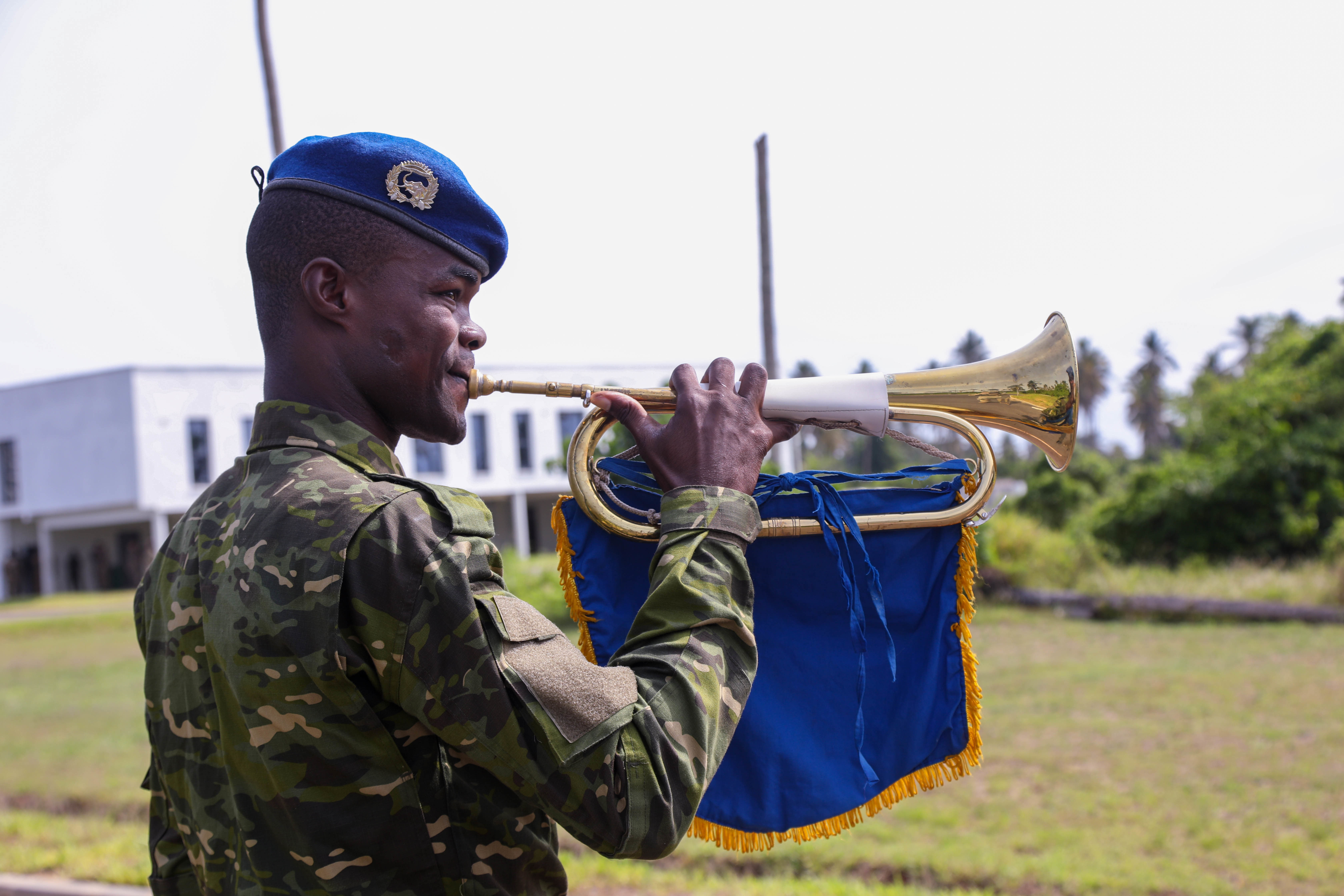 An Ivorian Soldier plays the bugle welcoming the arrival of Col.Maj. Lopoua Tibe Bi, Ivorian Special Operations commander, at Opening Ceremony-Côte d’Ivoire during Flintlock near Abidjan, Côte d’Ivoire, March 7, 2023. Flintlock is U.S. Africa Command’s premier and largest annual special operations exercise that strengthens key partner nations throughout Africa, in partnership with other international special operations forces. (U.S. Army photo by Sgt. Ashlind House)