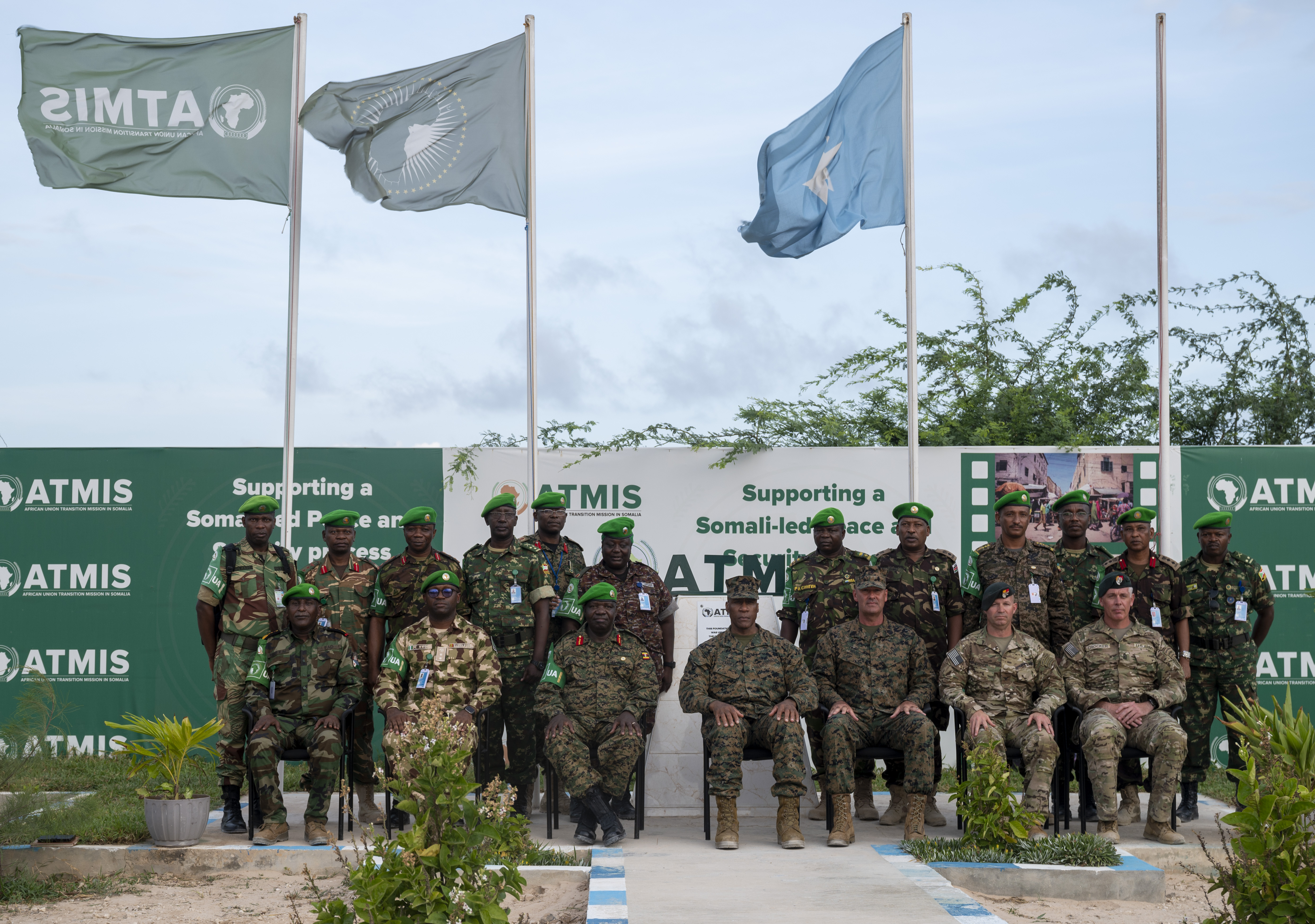The African Union Transition Mission in Somalia leaders and U.S. military leaders take a group photo outside the ATMIS headquarters in Mogadishu, Somalia, June 13, 2023. (U.S. Air Force photo by Airman 1st Class Natalie Vandergriff)