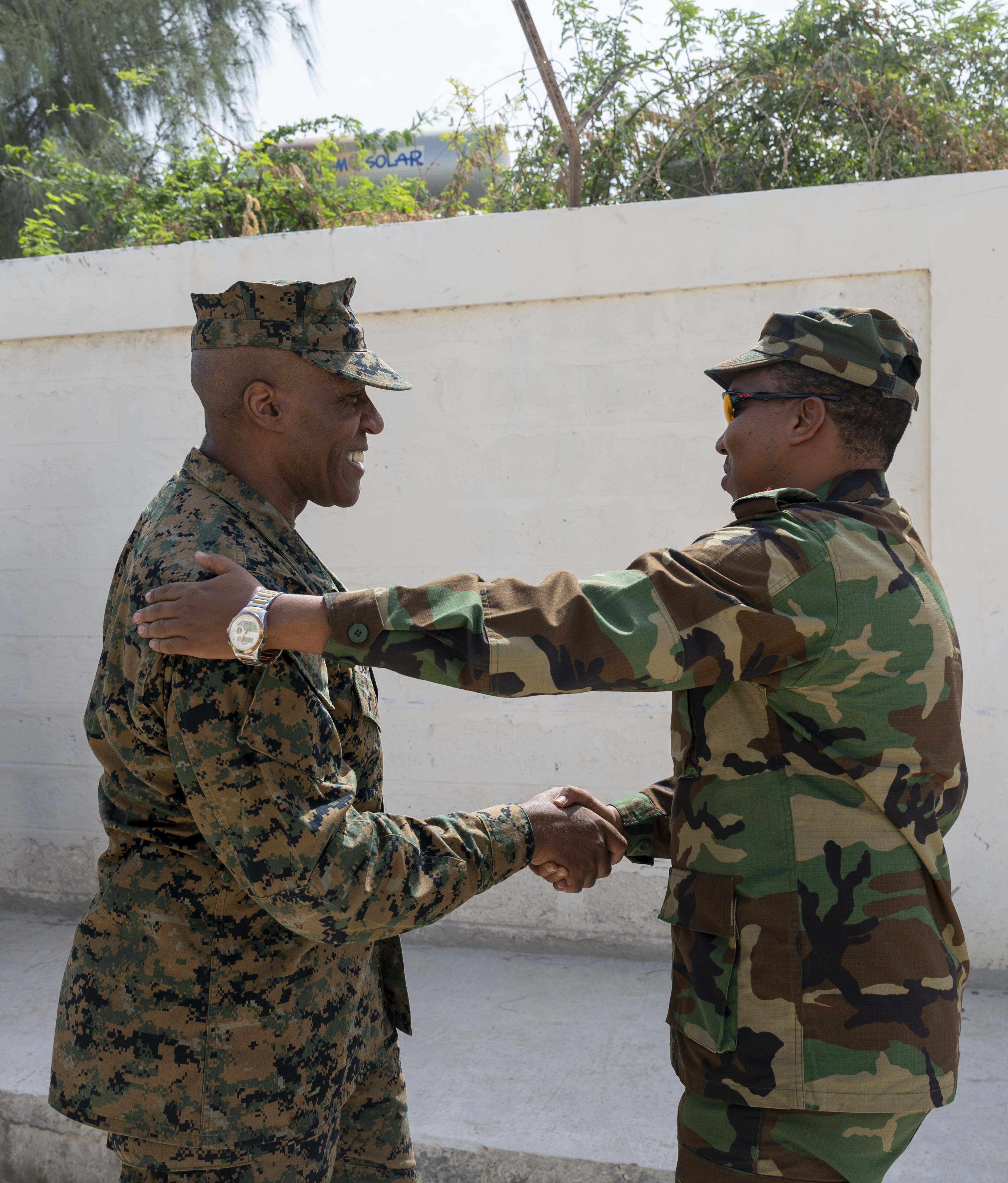 Gen. Michael Langley, commander, U.S. Africa Command (left), and Maj. Gen. Barise, Front Line States commander, greet each other outside the Joint Operations Control Center at Mogadishu, Somalia, June 13, 2023. (U.S. Air Force photo by Airman 1st Class Natalie Vandergriff)