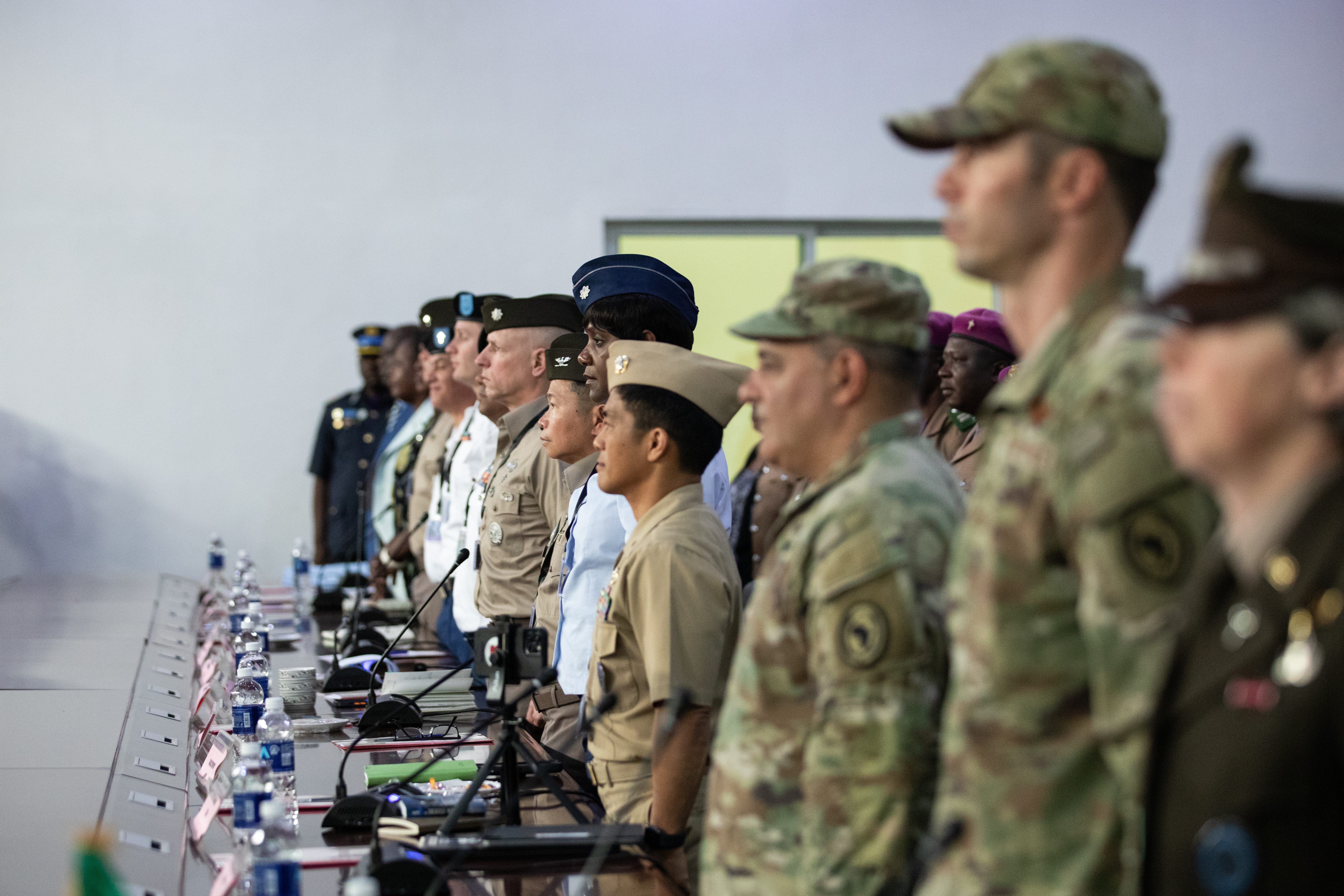 U.S. military members stand at attention for the Zambian National Anthem in Lusaka, Zambia as the Southern African Development Community (SADC) event kicks off, April 8, 2024. The Zambian Defence Force invited U.S. military chaplains from the U.S. Africa Command, U.S. Army Southern European Task Force, Africa (SETAF-AF), U.S. Air Forces Africa (AFAF), North Carolina and New York Army National Guards to participate in a five-day SADC event in Lusaka, Zambia. The workshop aimed to enhance spiritual readiness for military personnel and their families, sharing best practices, and deepening relations with chaplains from Zambia, Botswana, Malawi, Namibia, and Democratic Republic of the Congo, marking a milestone in international cooperation and understanding. (U.S. Army photo by Spc. Ebony Neal)