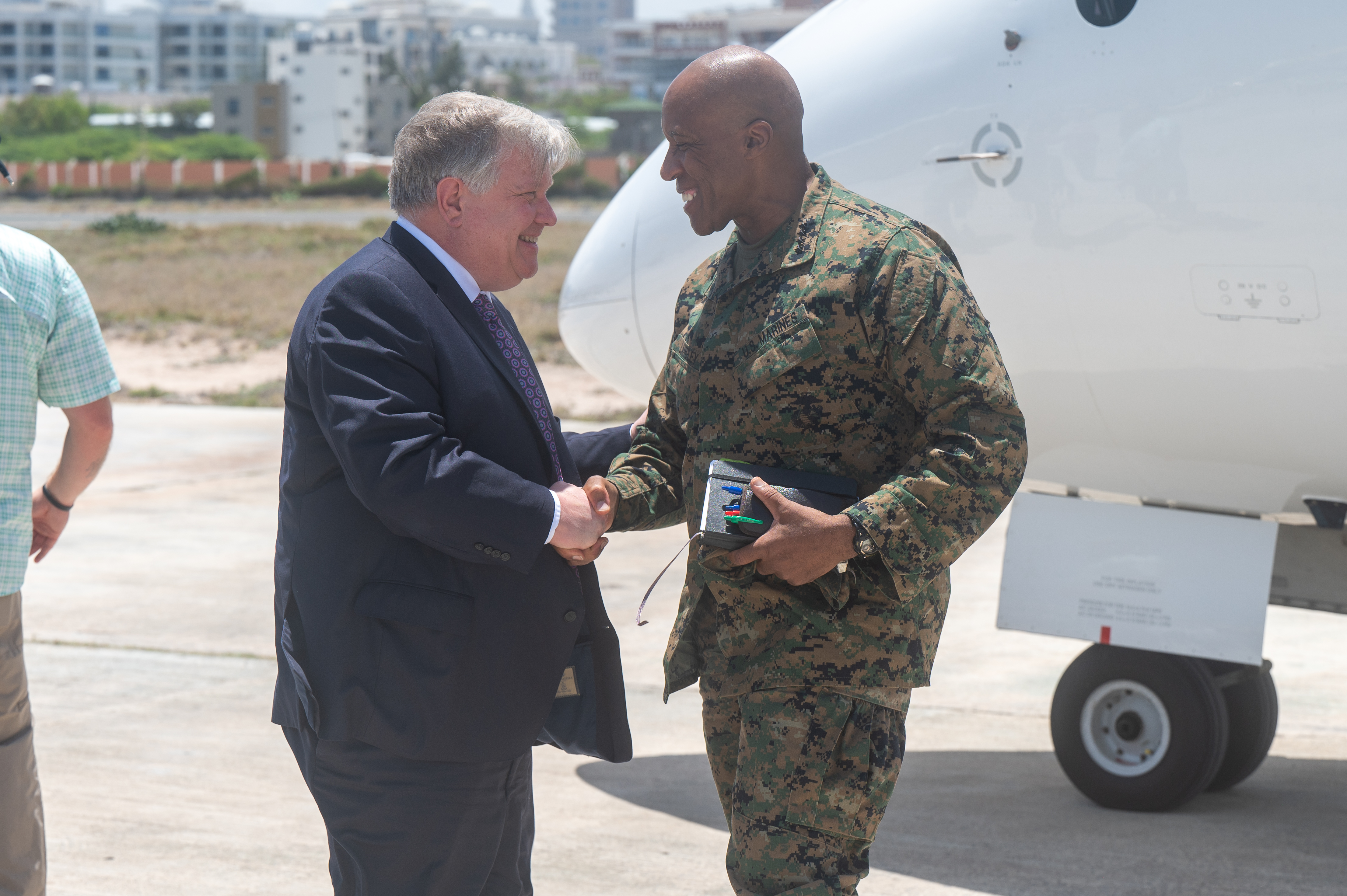 The Honorable Richard H. Riley, U.S. Ambassador to Somalia greets, U.S. Marine Corps Gen. Michael E. Langley, Commander of United States Africa Command before engagements with Hassan Sheikh Mohamud, President of Somalia in Mogadishu, Somalia, Sep. 09, 2024. The visit builds on the ongoing partnership between the U.S. and Somalia in the fight against Al-shabab. U.S. Africa Command is one of seven U.S. Department of Defense geographic combatant commands. The command is responsible for all U.S. military operations, exercises, security cooperation, and conducts crisis response on the African continent in order to advance U.S. interests and promote regional security, stability, and prosperity. (U.S. Air Force photo by Tech. Sgt. Kyle Brasier)