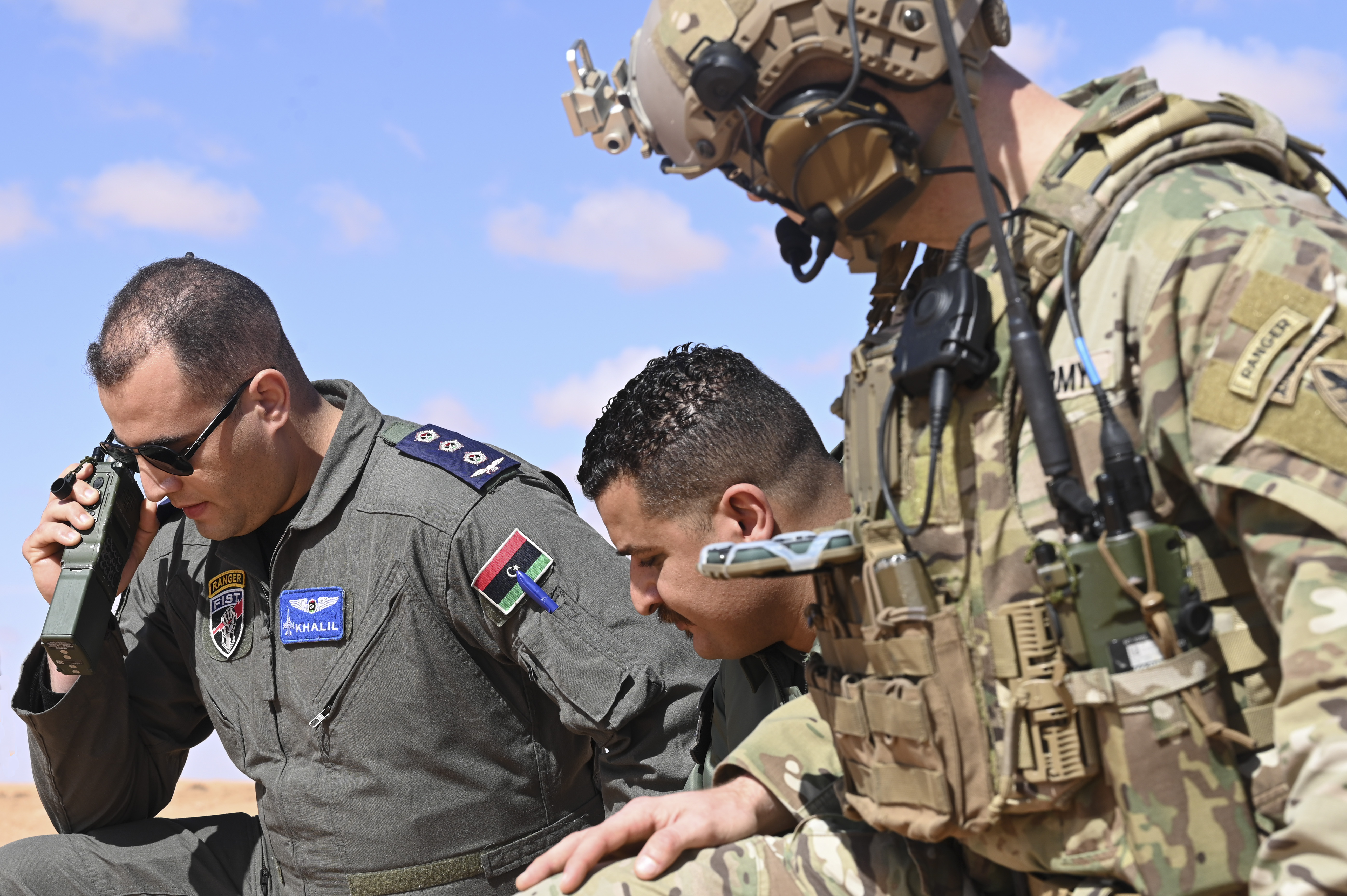 250226-F-UN699-1165: Libyan pilots partner together to conduct a close air support request with a B-52H Stratofortress overhead during a bomber task force demonstration to promote the process of reunification of Libyan military and security institutions, conducted near Sirte, Libya, Feb. 26, 2025. Bomber missions contribute to U.S. and international partner readiness, interoperability and proficiency, strengthening the ability to address mutual security challenges and goals. (U.S. Air Force photo by Staff Sgt. Jake Carter)