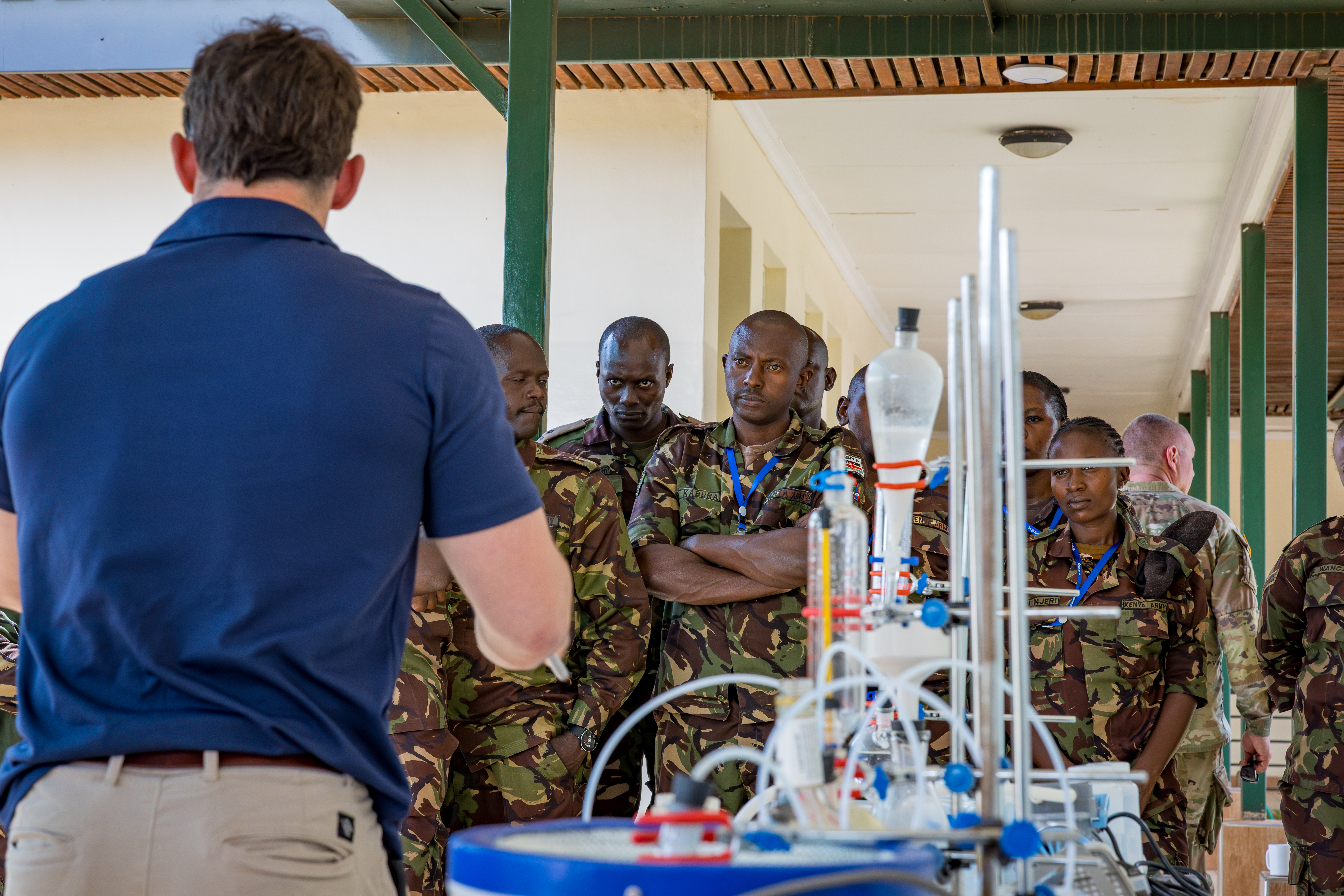 A U.S. Navy Explosive Ordnance Disposal (EOD) instructor, along with experts from U.S. Africa Command’s (USAFRICOM) Technical Support Group, and the U.S. Bureau of Alcohol, Tobacco, Firearms and Explosives, provides chemical and biological hazard training to Kenyan Disaster Response Battalion personnel during exercise Justified Accord 2025 (JA25) at the Humanitarian Peace Support School in Nairobi, Kenya, Feb. 13, 2025. The training included laboratory setup identification, protective measures and safe sampling techniques to mitigate risks associated with hazardous materials.