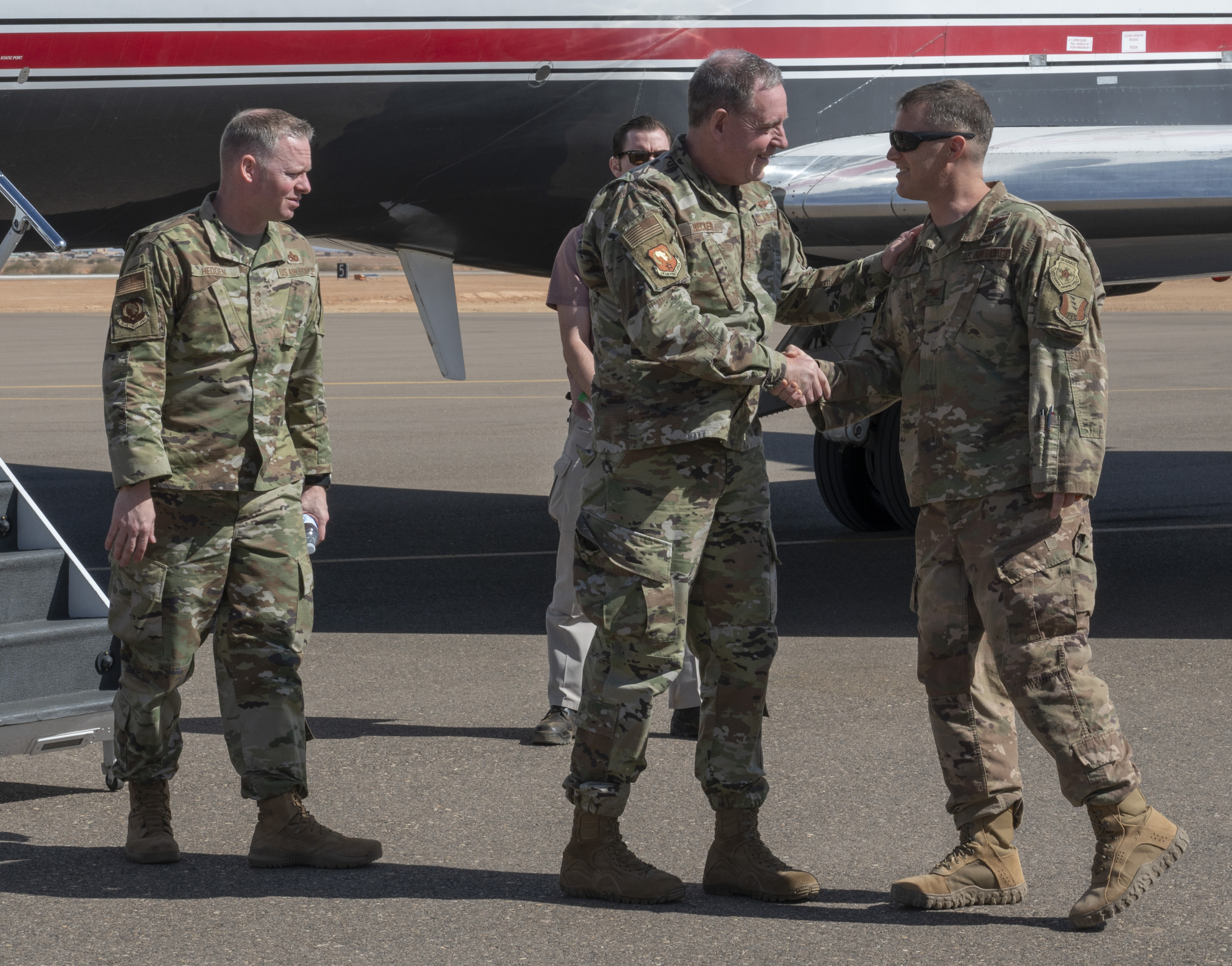 U.S. Air Force Gen. James Hecker, U.S. Air Forces in Europe and Air Forces Africa, commander, greets members of the 409th Expeditionary Security Forces Squadron during a base visit at Air Base 201, Niger, Oct. 29, 2022. Hecker was briefed on force protection along with a perimeter tour to better understand the installation’s significant improvements as well as ongoing challenges.