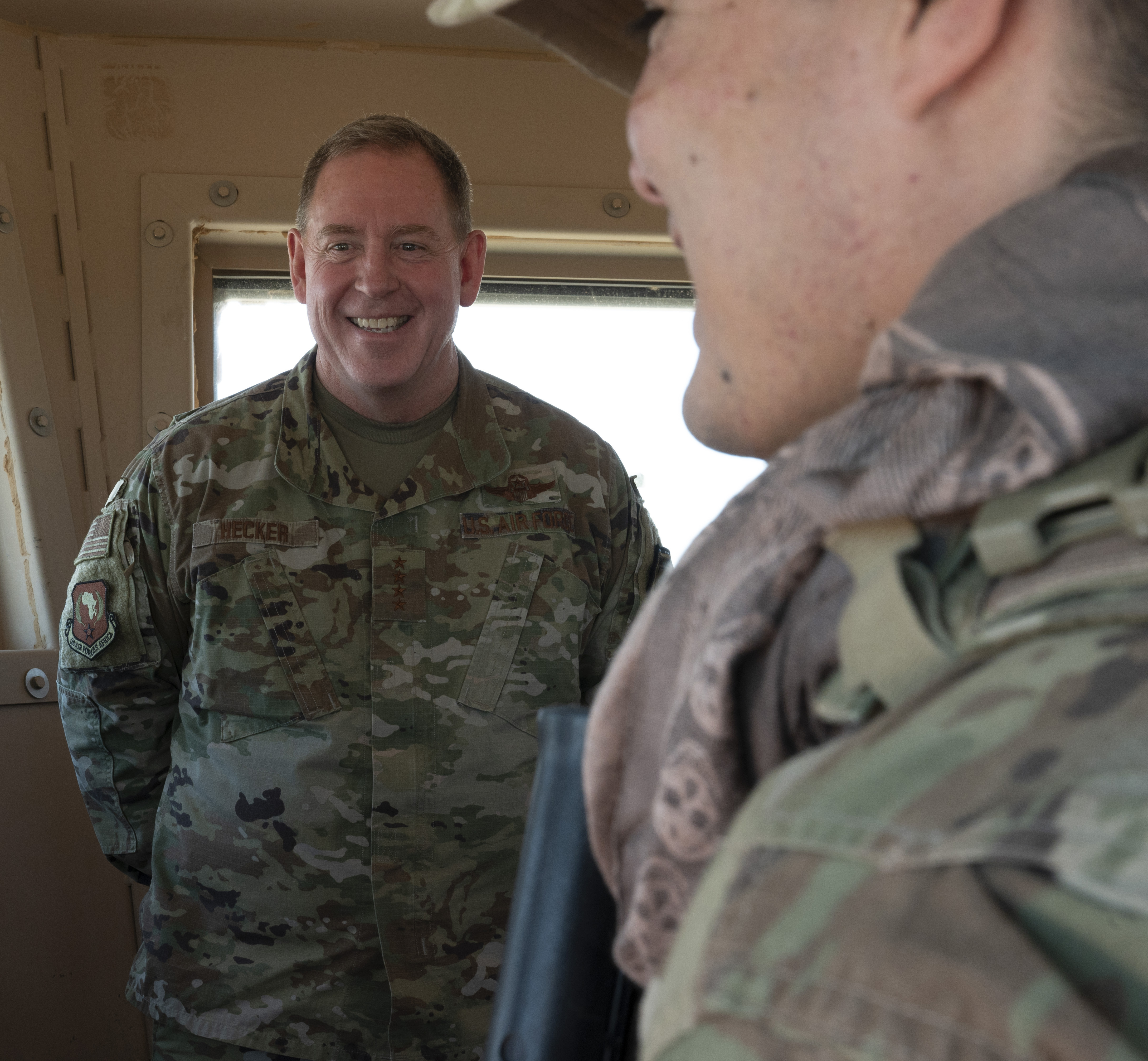 U.S. Air Force Gen. James Hecker, U.S. Air Forces in Europe and Air Forces Africa, commander, peers through binoculars at the defensive fighting positions tower as Staff Sgt. Sheldon Sugita, 409th Expeditionary Security Forces Squadron defender, stands next to him. During his tour, he was briefed on force protection along with a perimeter tour to better understand the installation’s significant improvements as well as ongoing challenges.