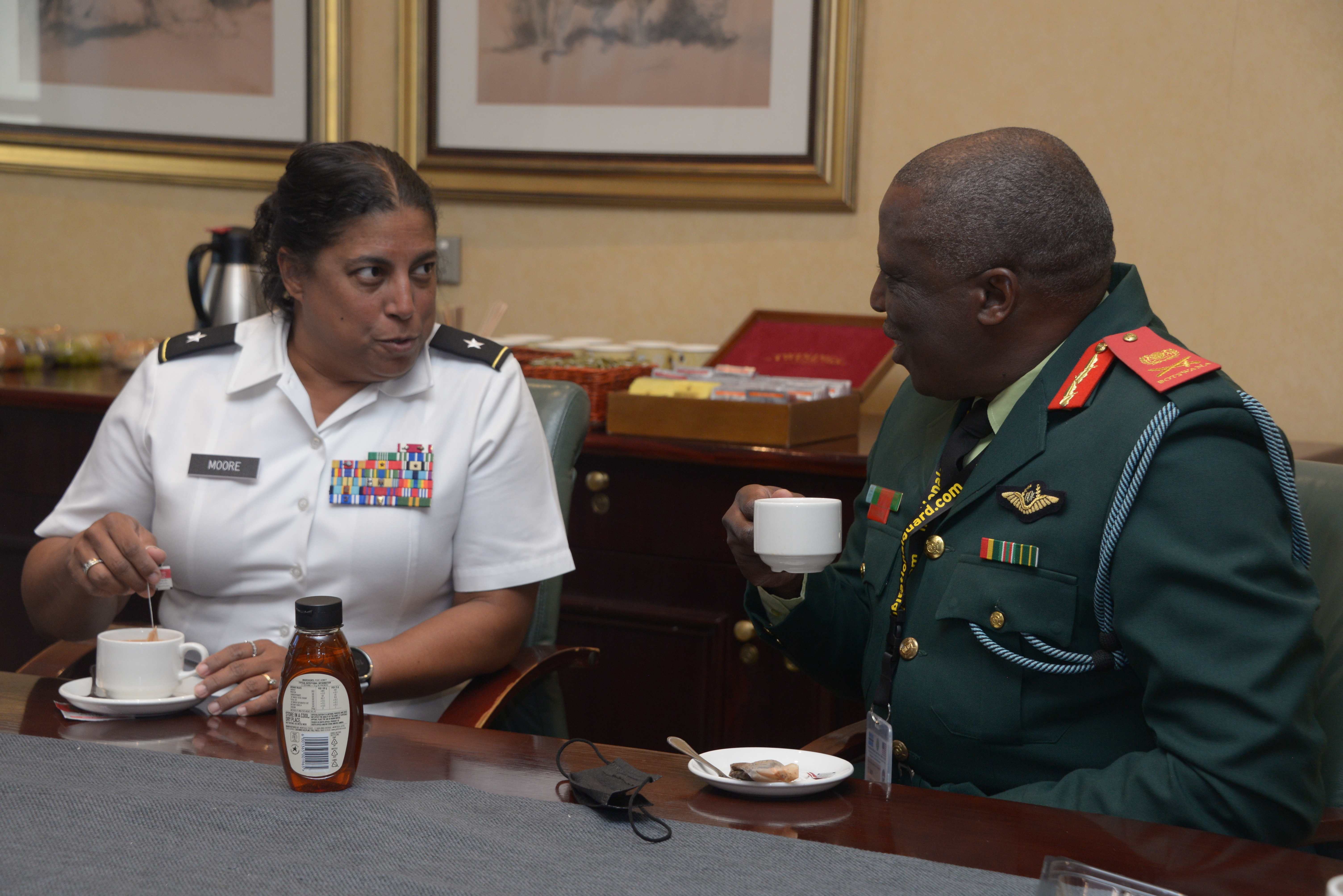 Commander of the Botswana Defence Force, Lt. Gen. Placid Segokgo, and the North Carolina National Guard Assistant Adjutant General of Sustainment, Brig. Gen. Cristina Moore, have tea to discuss partner relations during the 6th iteration of the African Military Law Forum at the Grand Palm Convention Center in Gaborone, Botswana, Aug. 6-10. The legal engagement brought together over 80 African military legal advisors, magistrates, and professionals from 40 countries in Africa to share best professional practices.