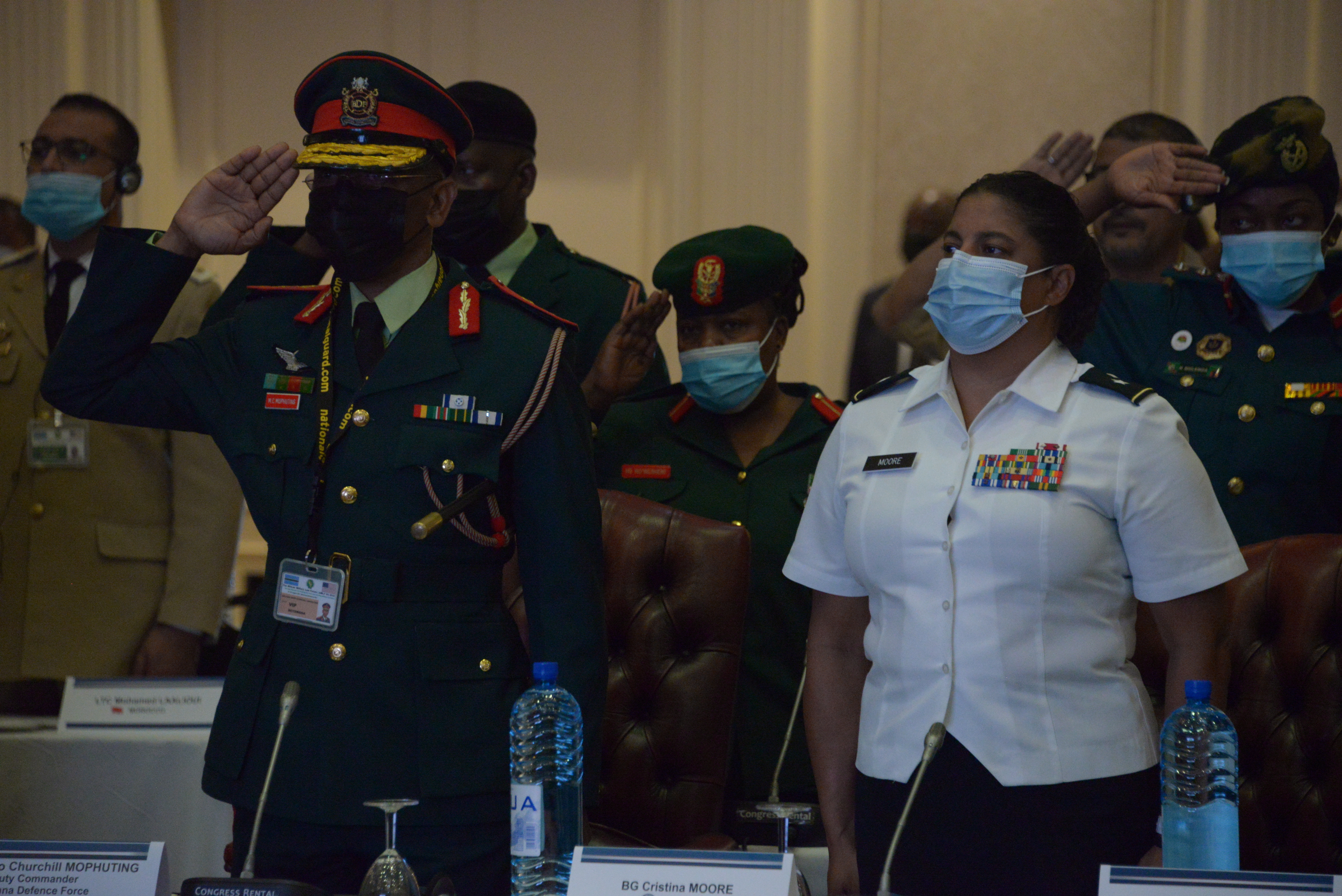 Botswana Defence Force Deputy Commander Maj. Gen., Mpho Mophuting, and the North Carolina National Guard Assistant Adjutant General of Sustainment, Brig. Gen. Cristina Moore, attend the official opening of the 6th iteration of the African Military Law Forum at the Grand Palm Convention Center in Gaborone, Botswana, Aug. 6-10. The legal engagement brought together over 80 African military legal advisors, magistrates, and professionals from 40 countries in Africa to share best professional practices.