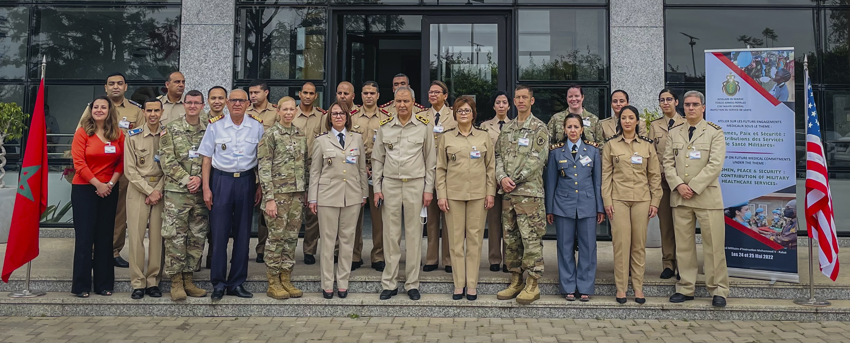 The U.S. Africa Command Surgeon held a Health Security Synchronization exchange with the Royal Moroccan Armed Forces (FAR) from May 23-26, 2022, at Mohamed V Military Training Hospital in Rabat, Morocco. Thirty male and female officers from the FAR participated in discussions surrounding UN resolution 1325, gender in military operations, and opportunities to promote female officer development within their armed forces.