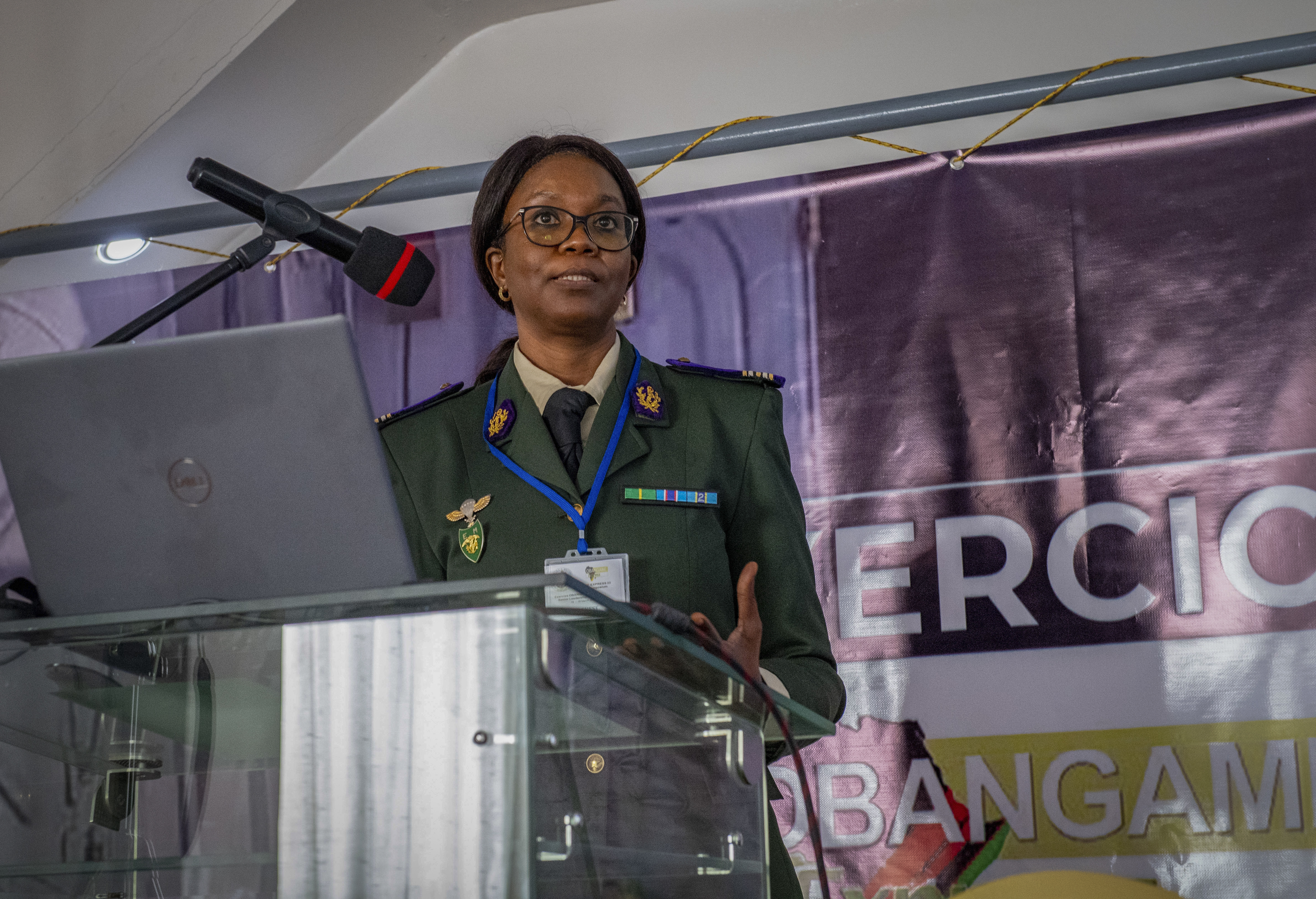 Lt. Col. Khadessa Sy, head of gender division, Senegalese Armed Forces, delivers the keynote speech for the Women, Peace, and Security presentation at the Senior Leadership Symposium as part of exercise Obangame Express 2022 at the Senegalese Naval Headquarters, in Dakar, Senegal, March 16, 2022. Obangame Express 2022 is a maritime exercise designed to improve cooperation and increase maritime security in the Gulf of Guinea and West Africa coastal regions.