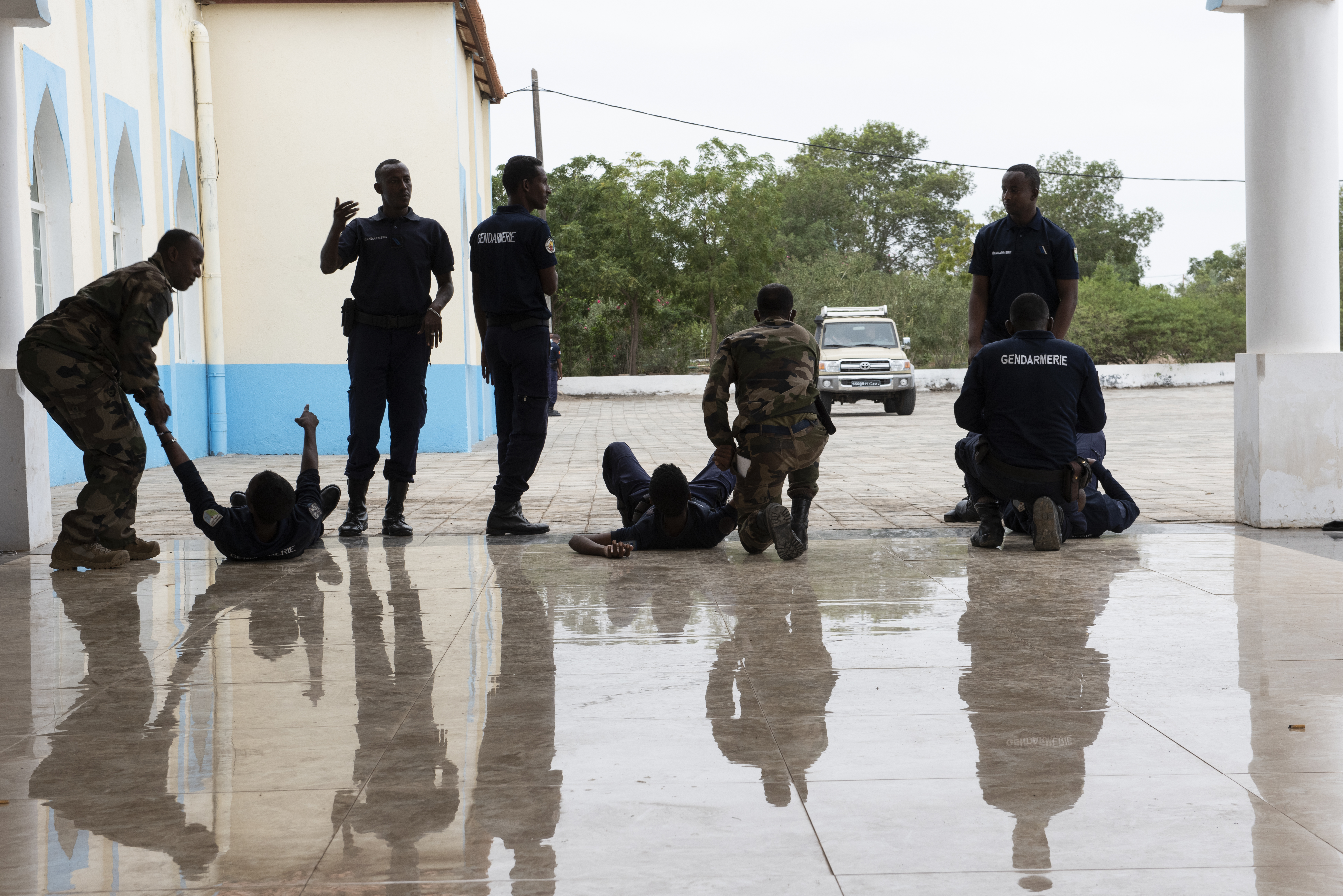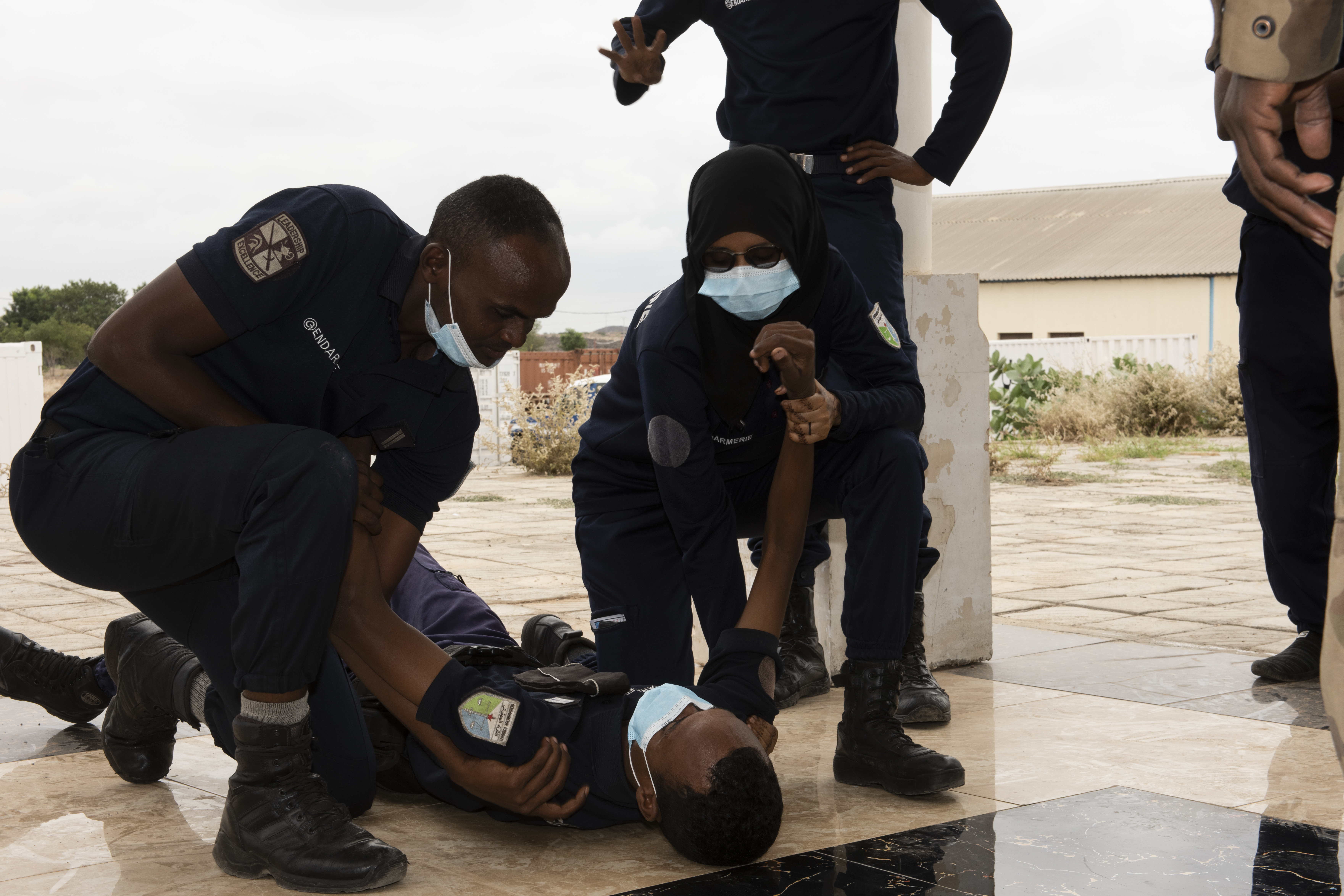 Members of the Djiboutian Gendarmerie prepare to practice tactical drag techniques during a medical knowledge exchange at the Gendarmerie compound in Djibouti, Africa, Jan. 17, 2022. Civil Affairs Soldiers from Combined Joint Task Force – Horn of Africa partnered with the Gendarmerie at their mobile unit for a four-day event which allowed both parties to share their medical practices and tactics through educational comparisons and hands-on practical application. CJTF-HOA, operating from Camp Lemonnier, Djibouti, regularly trains with and works alongside allied and partner nations, coalition forces and interagency/intergovernmental organizations to achieve a unified effort in East Africa. (U.S. Air Force photo by Tech. Sgt. Lynette M. Rolen)