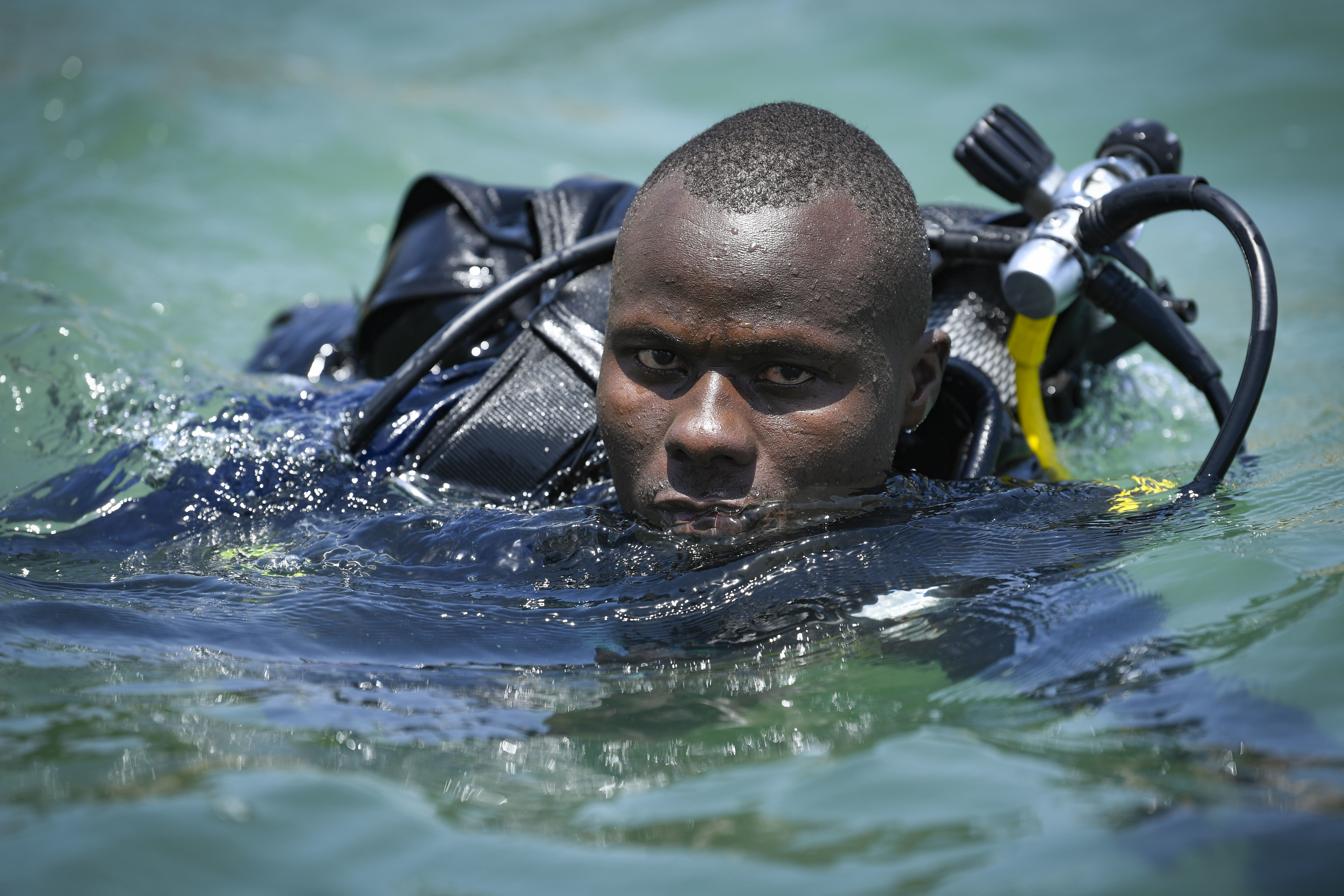 Kenyan diver Anthony Macharia conducts dive training at exercise Cutlass Express 2022 in Mombasa, Kenya, Feb. 16, 2022. Cutlass Express 2022, sponsored by U.S. Africa Command and conducted by U.S. Naval Forces Africa, is designed to improve regional cooperation among participating nations in order to increase maritime safety and security in the East Africa regions.