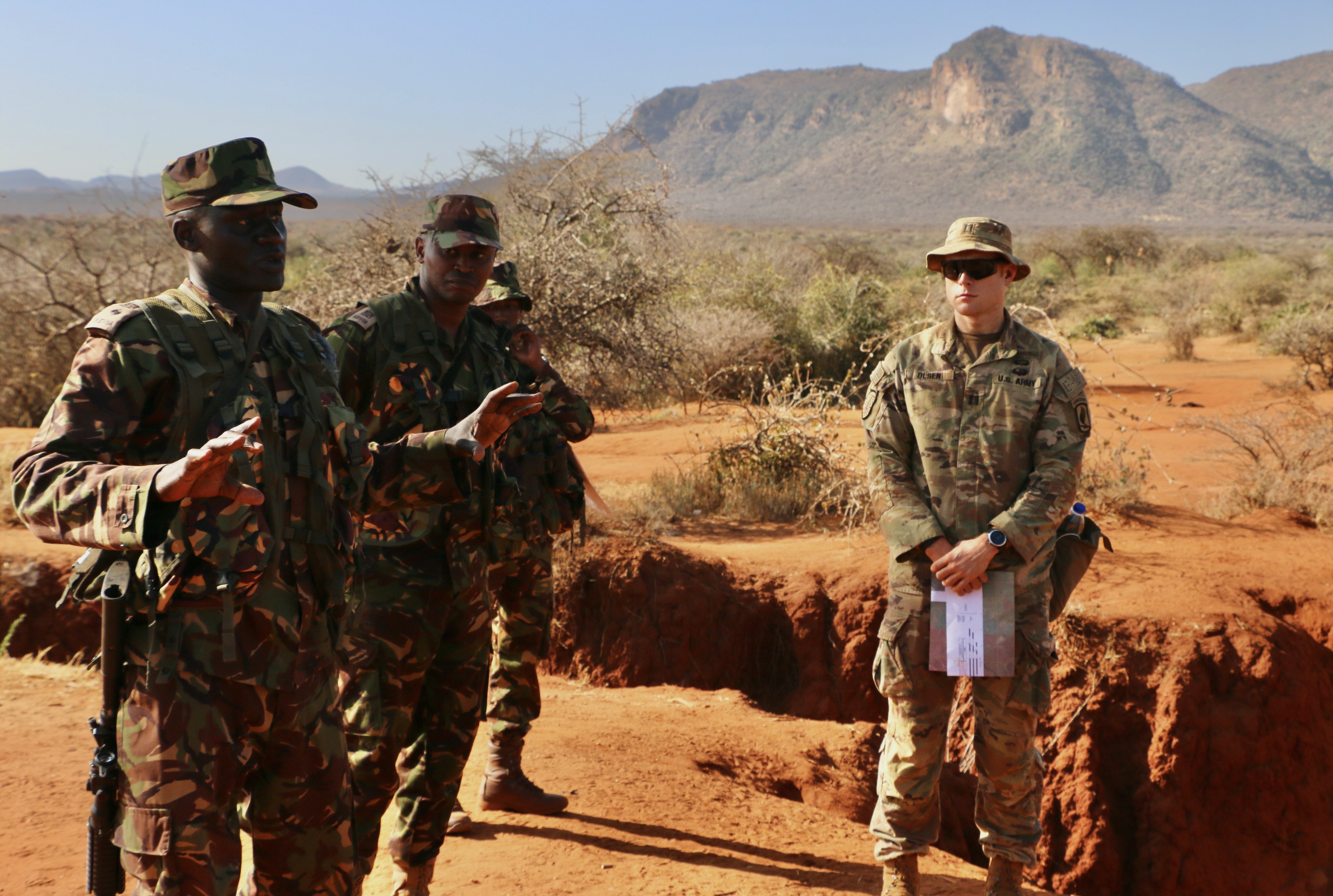 U.S. Army Soldiers from 1st Battalion, 503rd Infantry Regiment, 173rd Airborne Brigade, meet with Kenyan Defence Force Soldiers to discuss scheme of maneuver in preparation for a bi-lateral exercise during Justified Accord, March 13, 2022. The exercise, which started on Feb. 28, seeks to improve multinational interoperability and to incorporate regional civilian, police, and military entities into training.