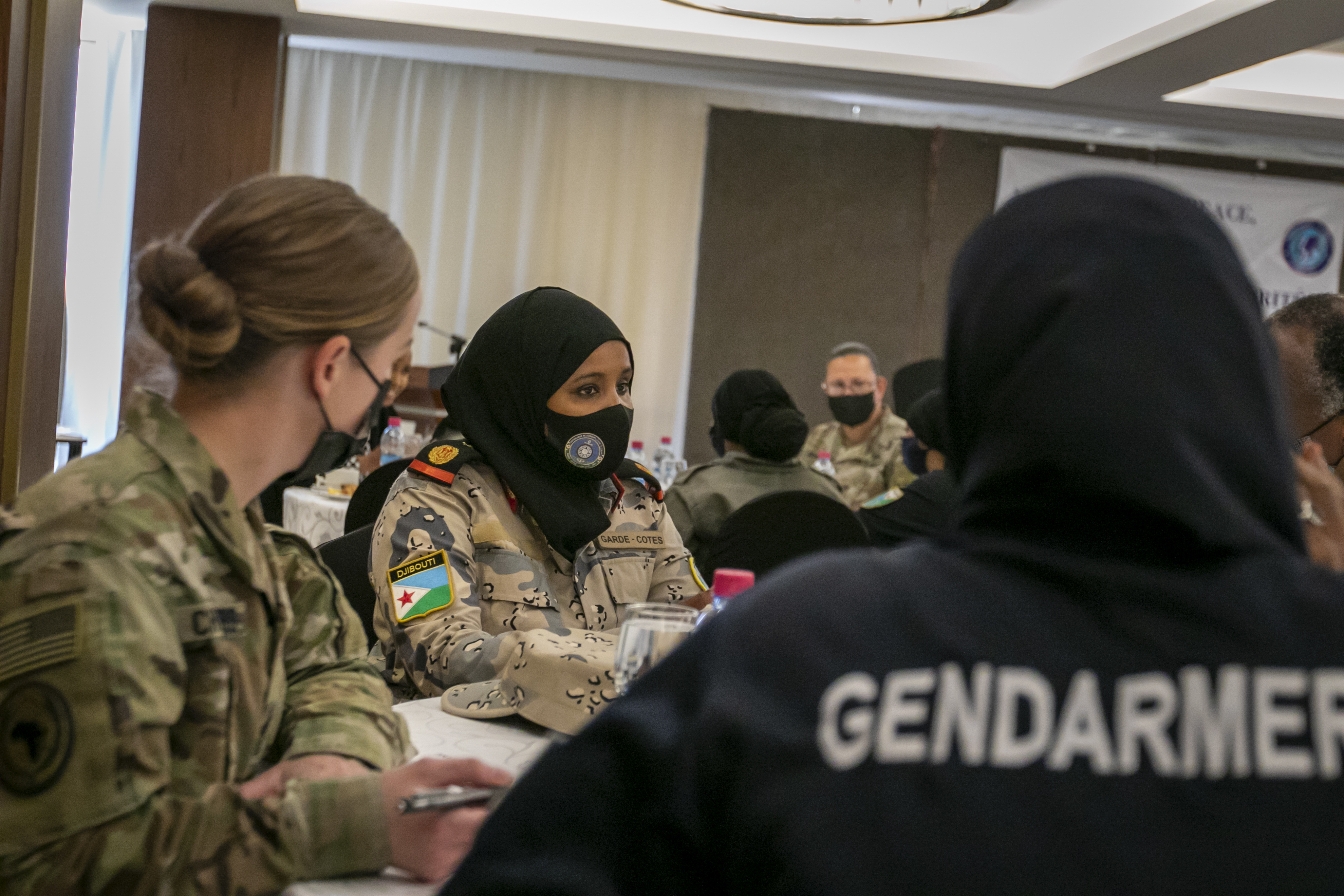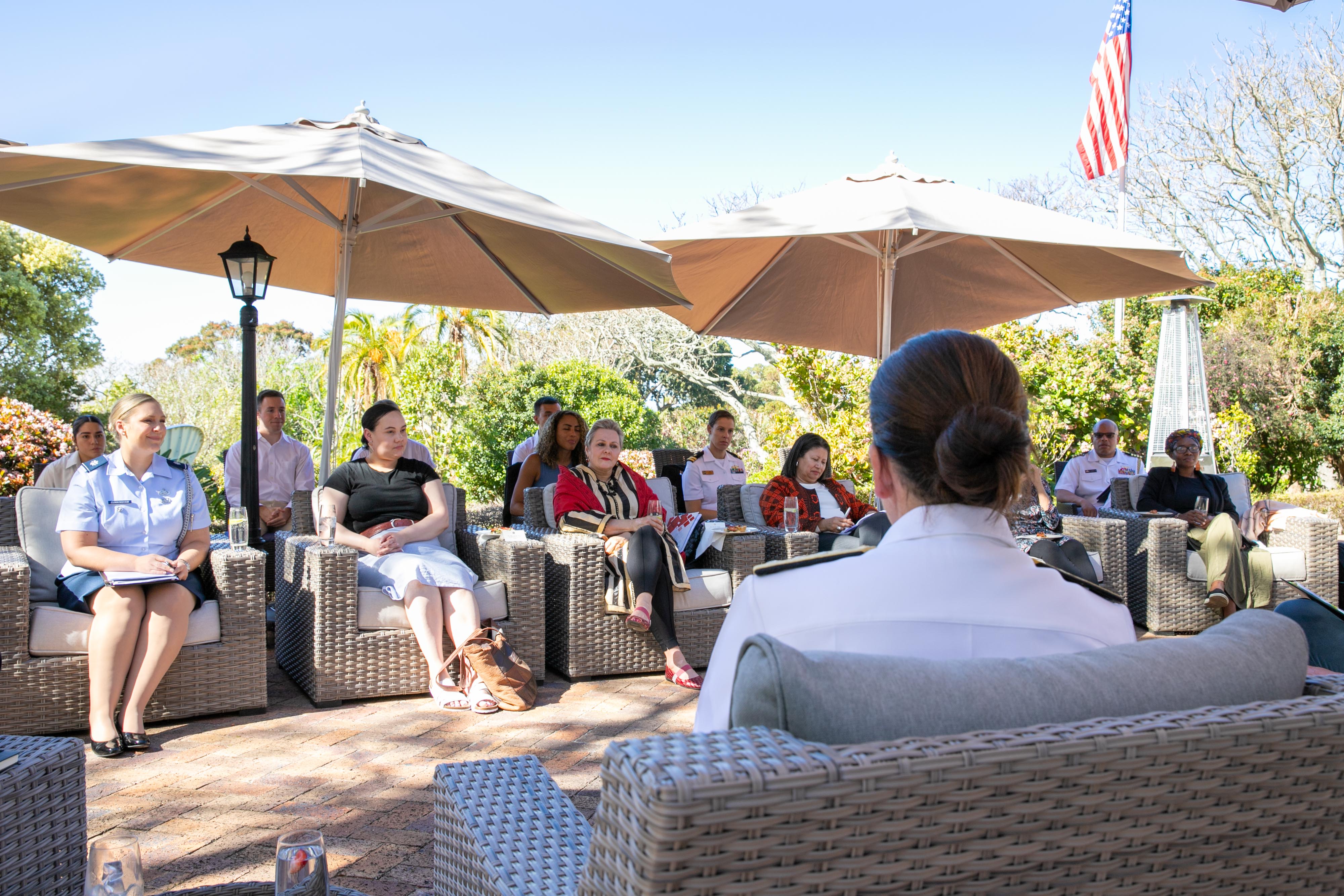 From left to right, Ann Castiglione-Cataldo, director, International Affairs and Foreign Policy Advisor to U.S. Coast Guard, Todd Haskel, Chargé d' affaires, U.S. Embassy South Africa, and Rear Adm. Nancy Lacore, chief of staff, U.S. Naval Forces Europe and Africa speak to a group during a Women, Peace, and Security event in Cape Town, South Africa , Oct. 6, 2021. U.S. Naval Forces Europe and Africa, headquartered in Naples, Italy, conducts the full spectrum of joint and naval operations, often in concert with allied and interagency partners, in order to advance U.S. national interests and security and stability in Europe and Africa.