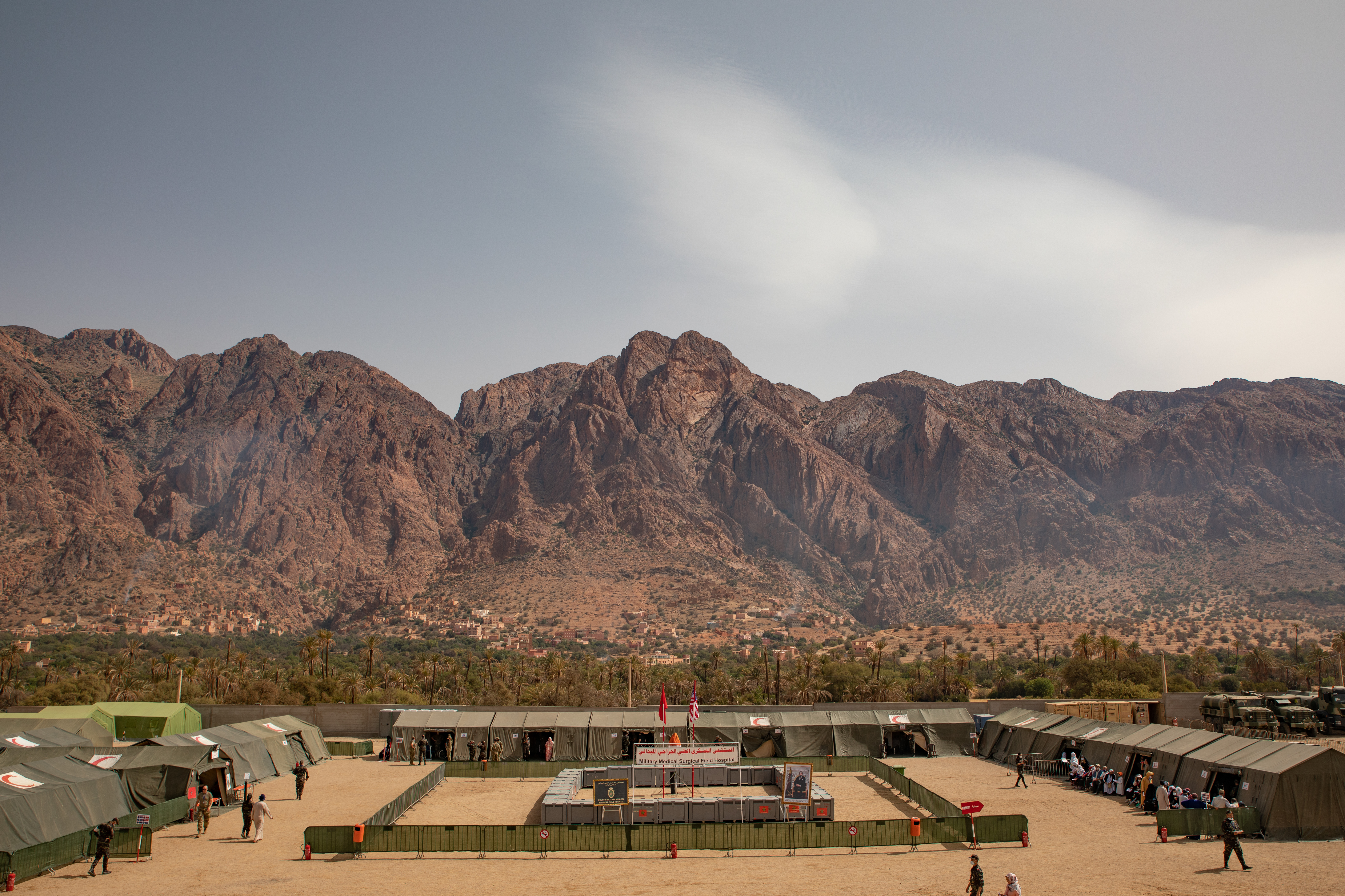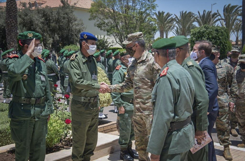 AGADIR, Morocco (JUNE 11, 2021) as part of African Lion 2021, Capt. Michael Concannon, commanding officer, Gold crew, center, leads a tour of the ship to U.S. Army and Moroccan armed forces personnel aboard the Expeditionary Sea Base USS Hershel “Woody” Williams (ESB 4) in Agadir, Morocco, June 11, 2021. African Lion 2021 is U.S. Africa Command’ largest, premier, joint, annual exercise hosted by Morocco, Tunisia and Senegal, 7-18 June. More than 7,000 participants from nine nations and NATO train together with a focus on enhancing readiness for U.S. and partner nation forces. AL21 is a multi-domain, multi-component, and multi-national exercise, which employs a full array of mission capabilities with the goal to strengthen interoperability among participants. (U.S. Navy photo by Mass Communication Specialist 2nd Class Eric Coffer/Released)