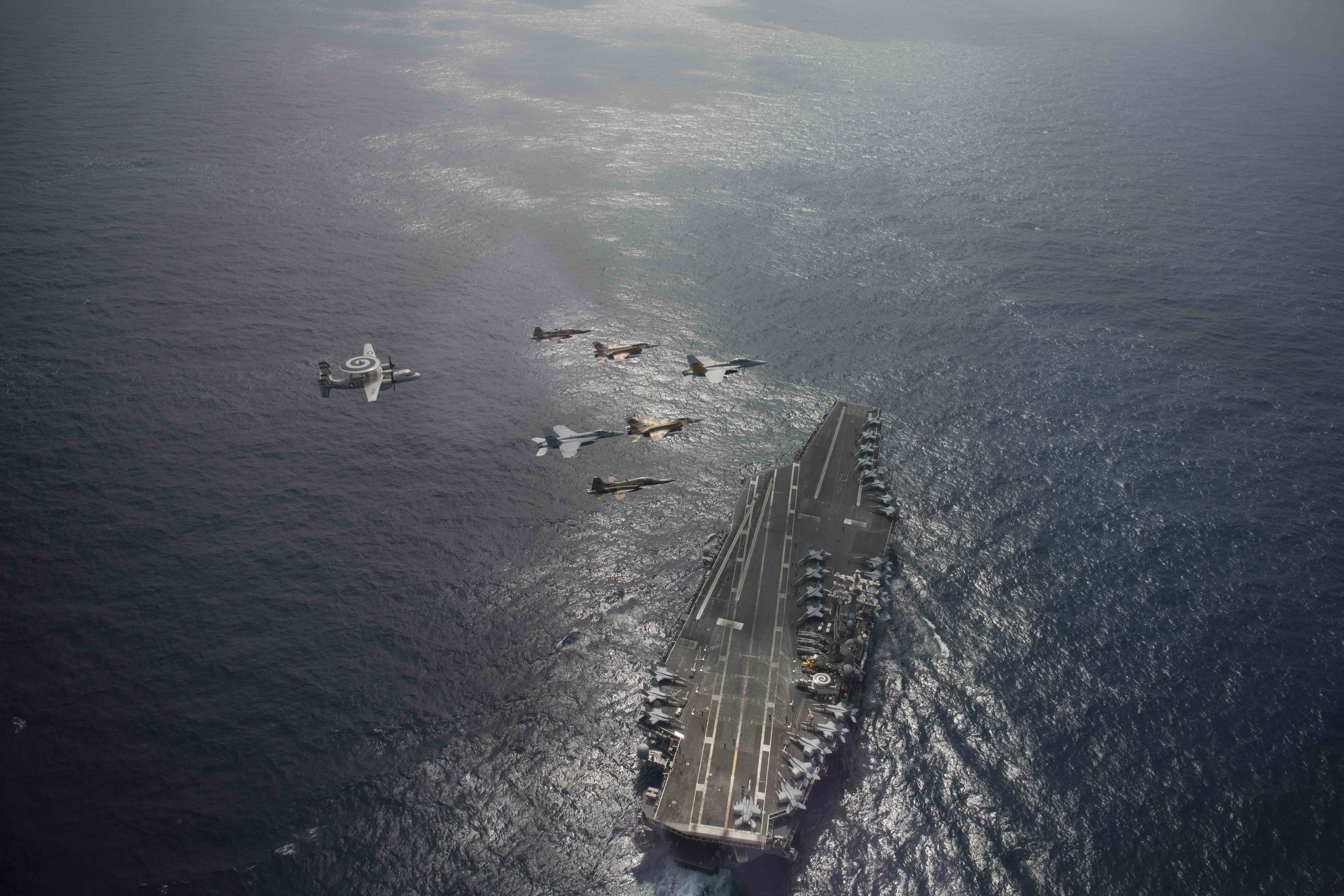 The Royal Moroccan Air Force (RMAF) and aircraft assigned to Carrier Air Wing (CVW) 3 fly over the Nimitz-Class aircraft carrier USS Dwight D. Eisenhower (CVN 69) in the Atlantic Ocean, March 3, 2021. The IKE Carrier Strike Group is participating in Lightning Handshake, a bi-lateral exercise between the U.S. and the Royal Moroccan Navy (RMN) and Royal Moroccan Air Force (RMAF).