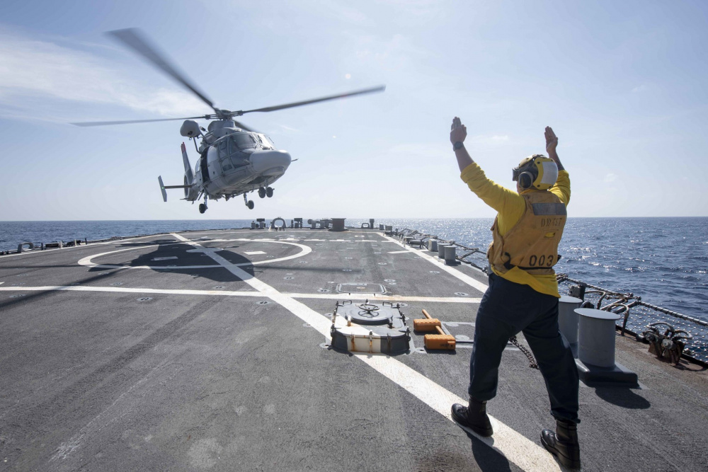 Boatswain's Mate 3rd Class Anthony Perkins, from Austin, Texas, signals to a Royal Moroccan Navy Eurocopter AS565 Panther, as it prepares to land onboard the Arleigh Burke-class guided-missile destroyer USS Mitscher (DDG 57), March 4, 2021. The IKE Carrier Strike Group is participating in Lightning Handshake, a bi-lateral maritime exercise between the U.S. and Royal Moroccan Navy (RMN) and Royal Moroccan Air Force (RMAF).