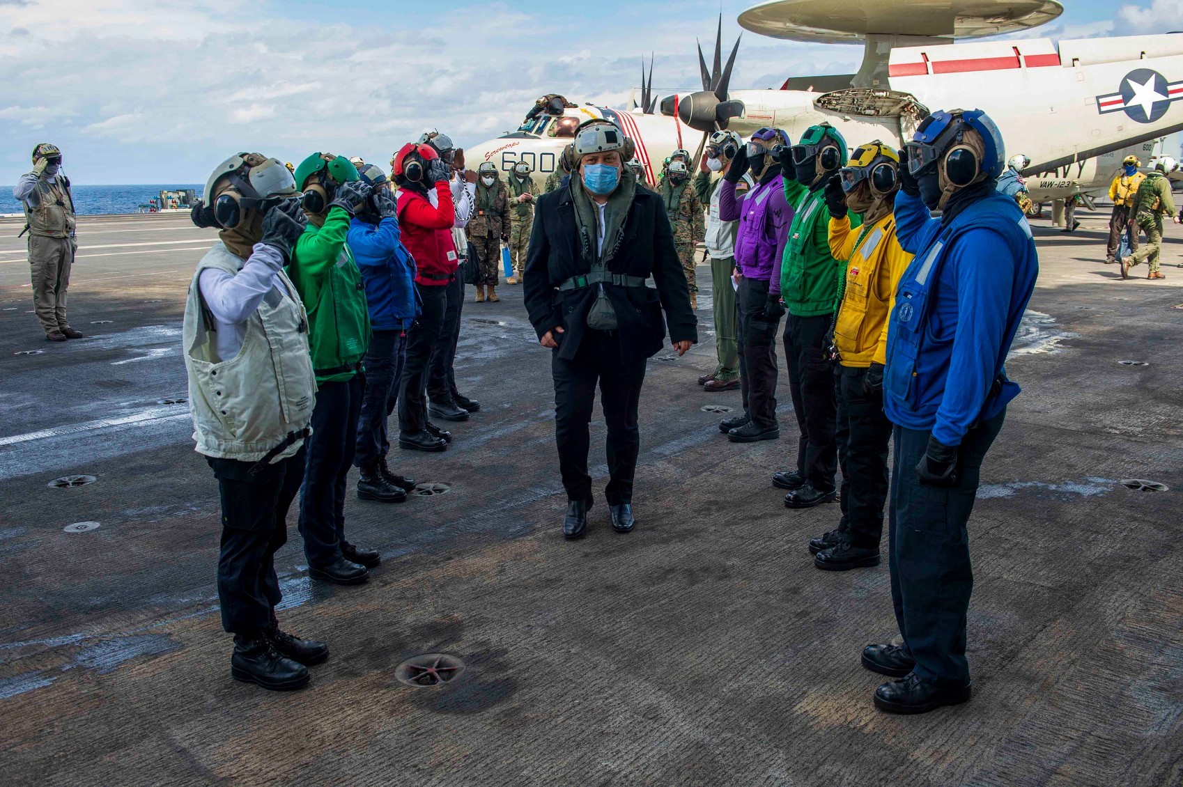 U.S. Army Gen. Stephen Townsend, commander, U.S. Africa Command, salutes Sailors on the flight deck as he arrives aboard the Nimitz-class aircraft carrier USS Dwight D. Eisenhower (CVN 69), in the Mediterranean Sea, March 25, 2021. The IKE Carrier Strike Group is on a scheduled deployment in the U.S. Sixth Fleet area of operations in support of U.S. national interests and security in Europe and Africa.