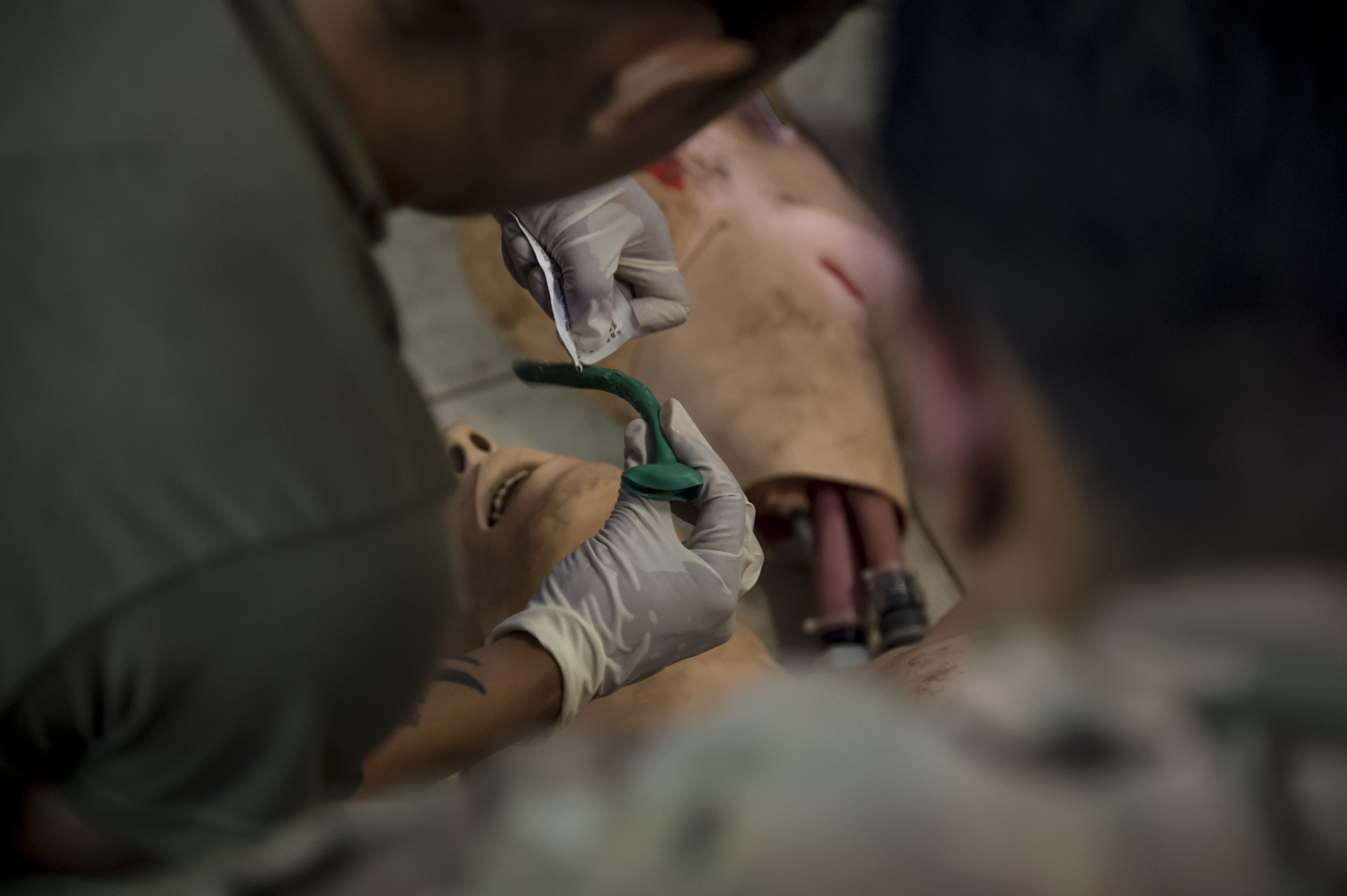 U.S. Army Sgt. Marina Ovalles, Combined Joint Task Force-Horn of Africa supply sergeant, lubes the nasopharyngeal airway during the practical application assessment portion of the test to certify in the combat lifesaver course held on Camp Lemonnier, Djibouti, Sept. 15, 2017. The U.S. Army Combat Lifesaver Course is intended to bridge first aid training – self and buddy care — and the medical training given to combat medics. (U.S. Air National Guard photo by Tech. Sgt. Joe Harwood)