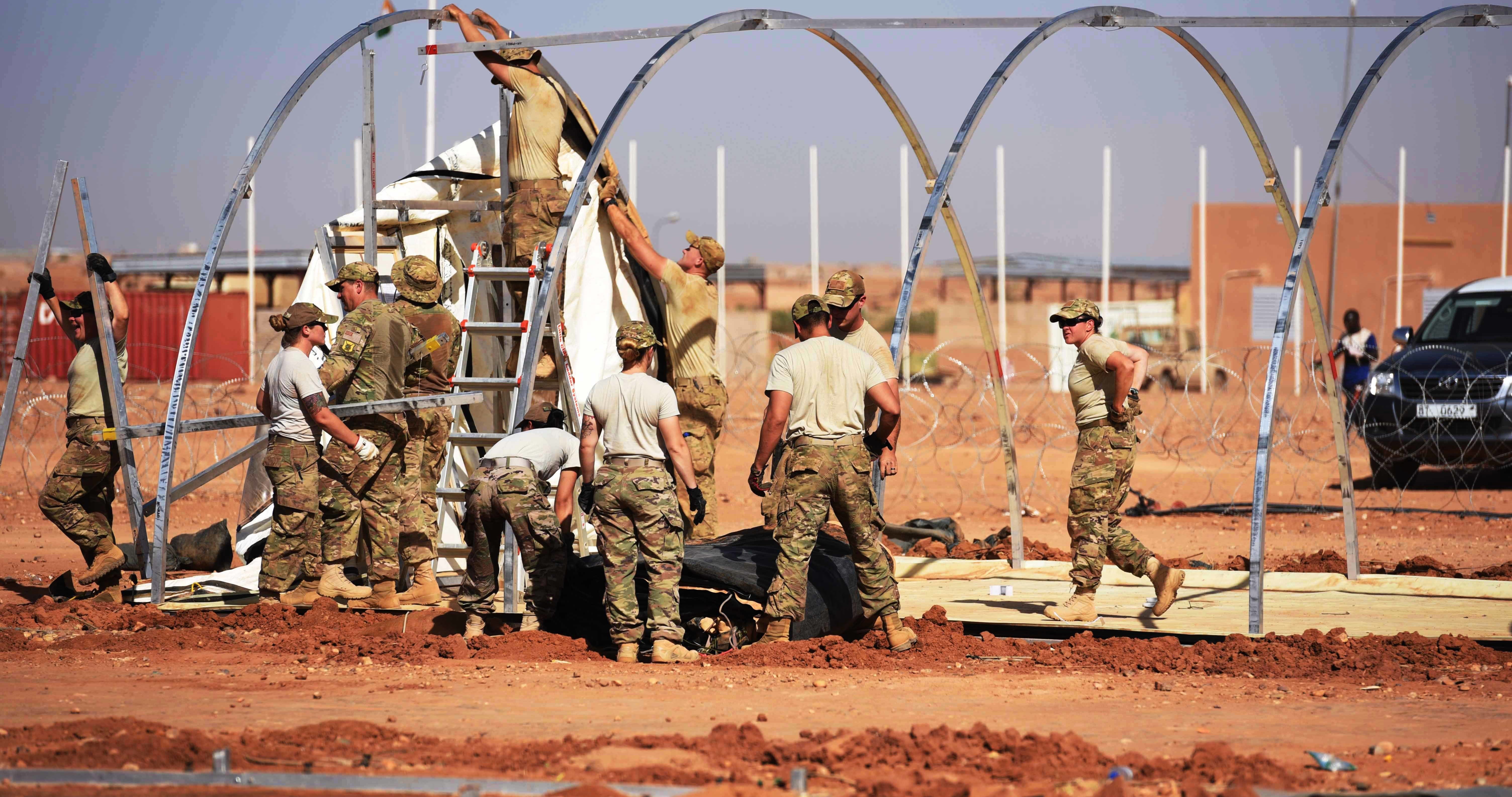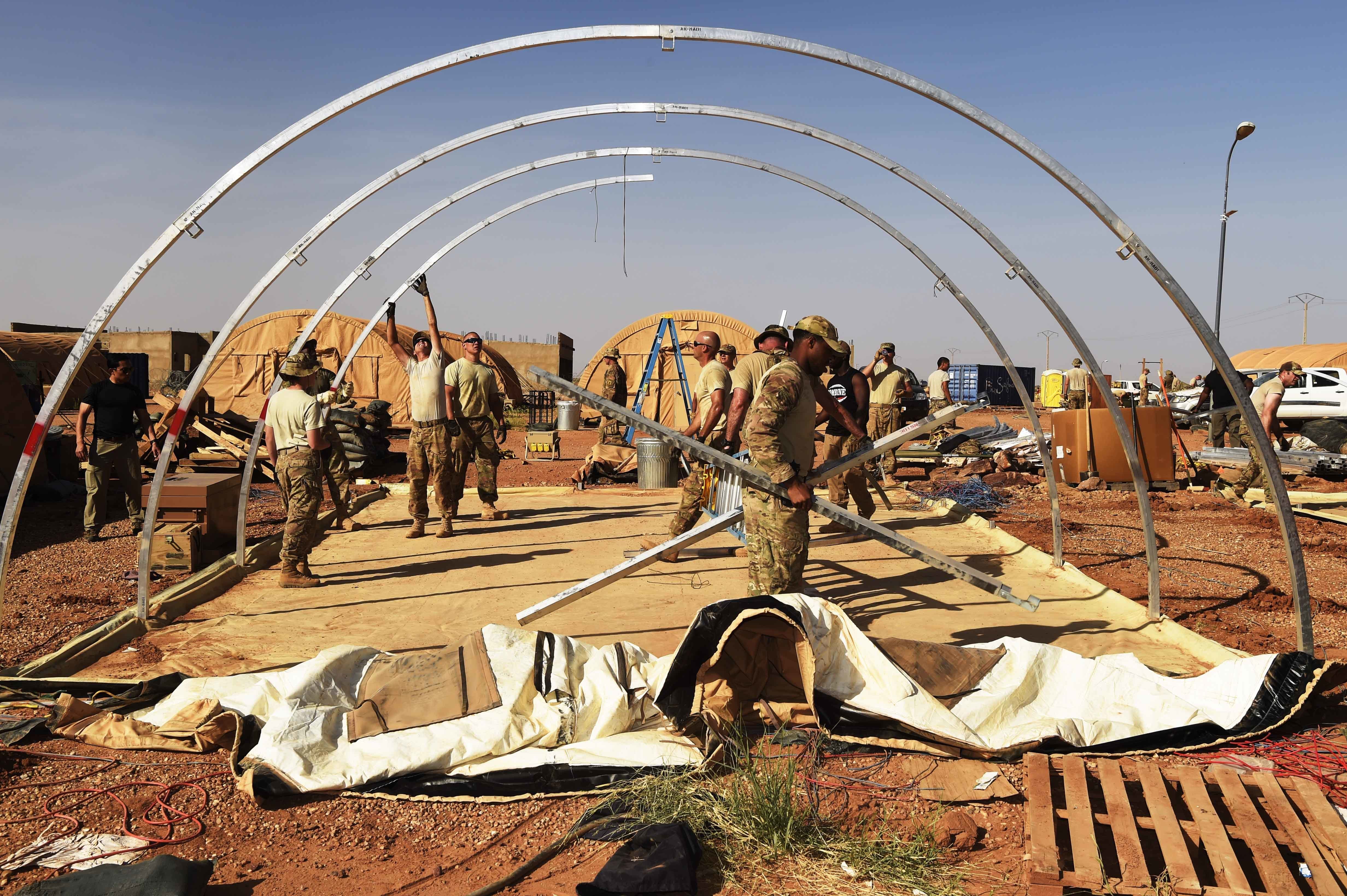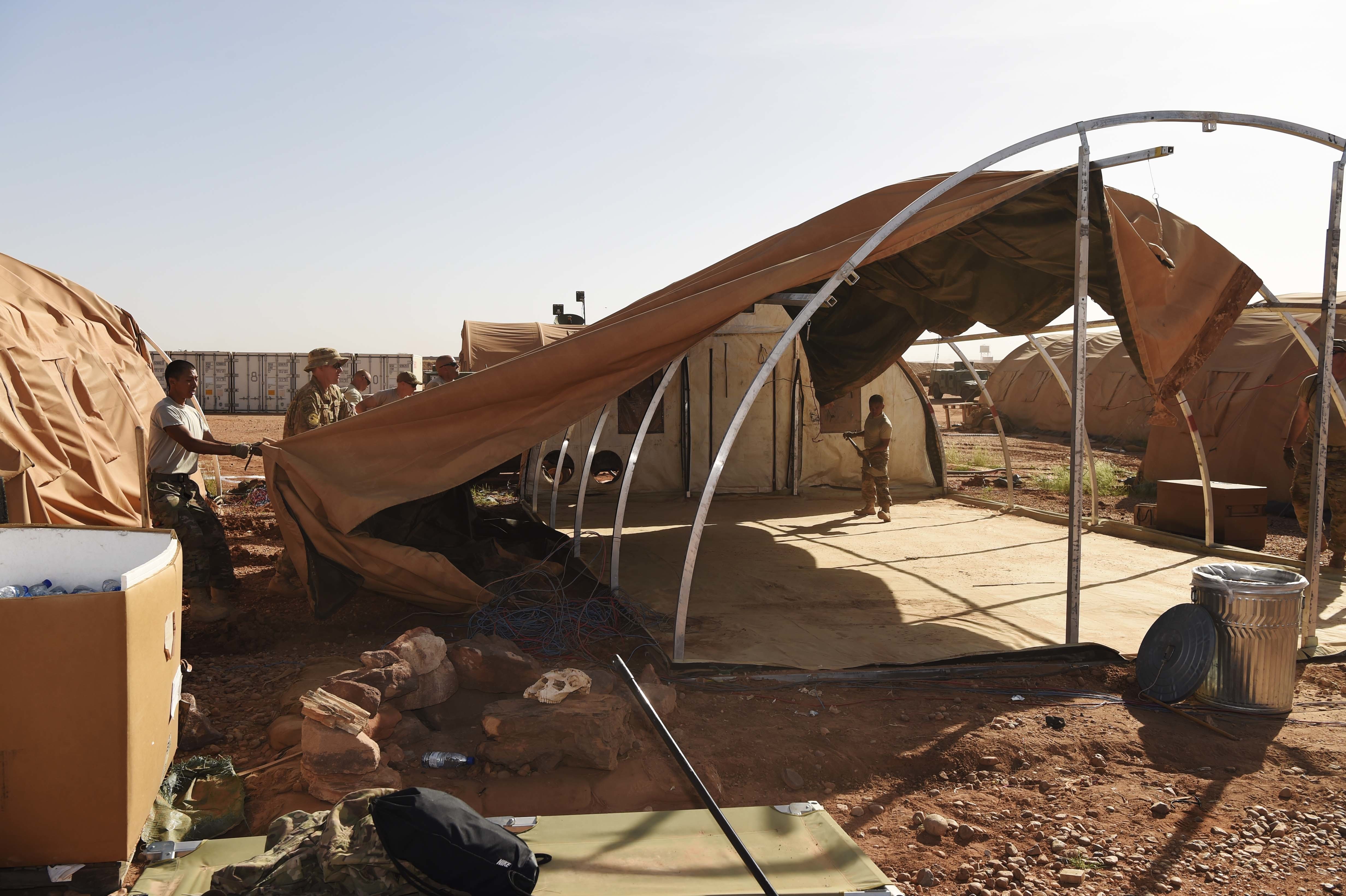 Airmen from the 724th Expeditionary Air Base Squadron take down tents from the old base to move to a new location, Sept. 11, 2017, at Air Base 201, Agadez, Niger. The move to the bigger base is called “FLEXIT,” short for "Flintlock Exit.” Being located in this deployed environment requires temporary housing in lieu of traditional infrastructure. (U.S. Air Force photo by Staff Sgt. Joshua R. M. Dewberry/released)