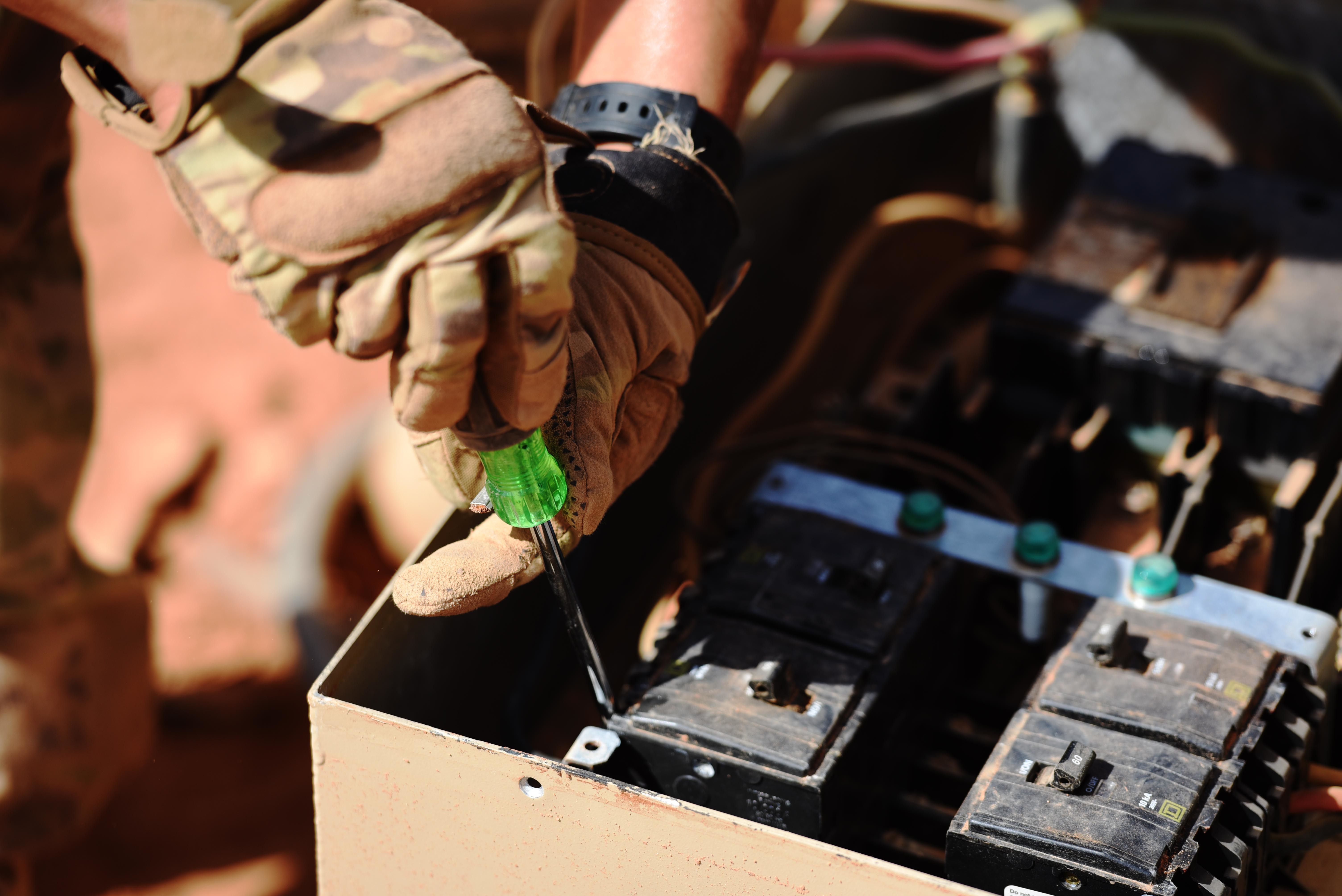 An Airman from the 724th Expeditionary Air Base Squadron works on electric equipment connected to cold storage units at a new base location, Sept. 09, 2017, at Air Base 201, Agadez, Niger. The move to the bigger base is called “FLEXIT,” short for "Flintlock Exit.” All the electrical equipment at Air Base 201 must be able to function in hot weather and frequent dust storms. (U.S. Air Force photo by Staff Sgt. Joshua R. M. Dewberry/released)