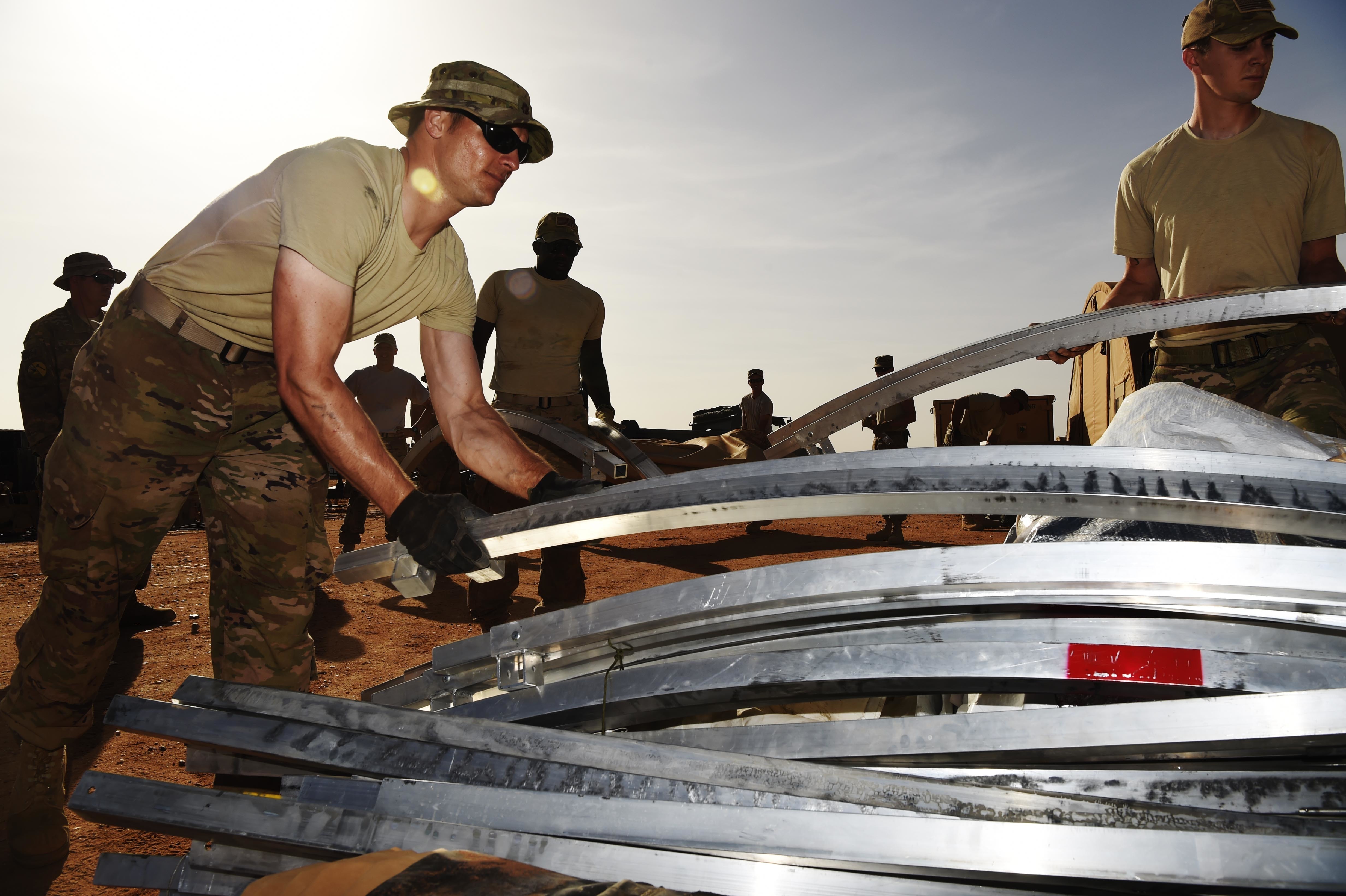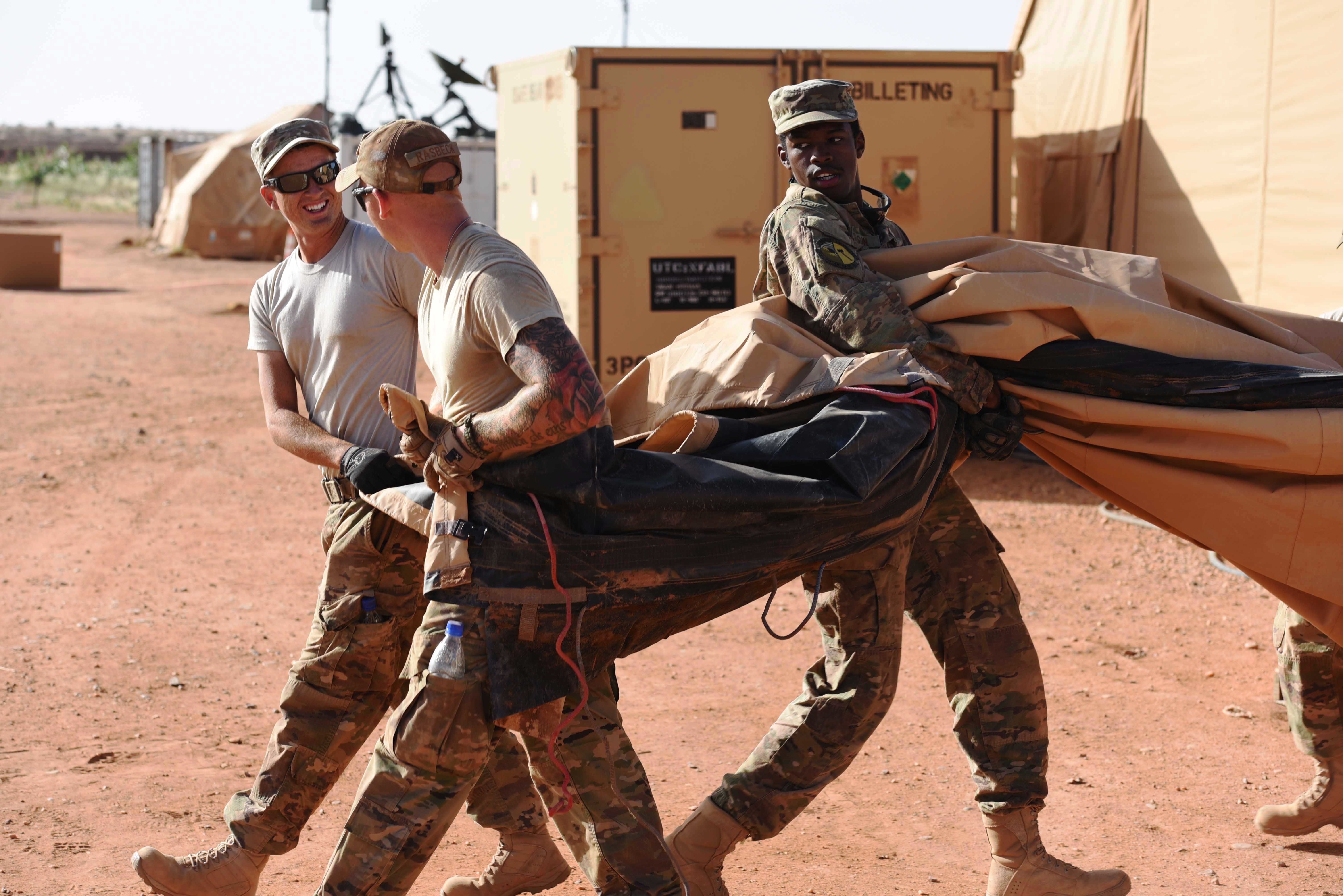 Airmen from the 724th Expeditionary Air Base Squadron move the covers from tents from the old base to their new location, Sept. 11, 2017, at Air Base 201, Agadez, Niger. The move to the bigger base is called “FLEXIT,” short for "Flintlock Exit.” Being located in this deployed environment requires temporary housing in lieu of traditional infrastructure. (U.S. Air Force photo by Staff Sgt. Joshua R. M. Dewberry/released)