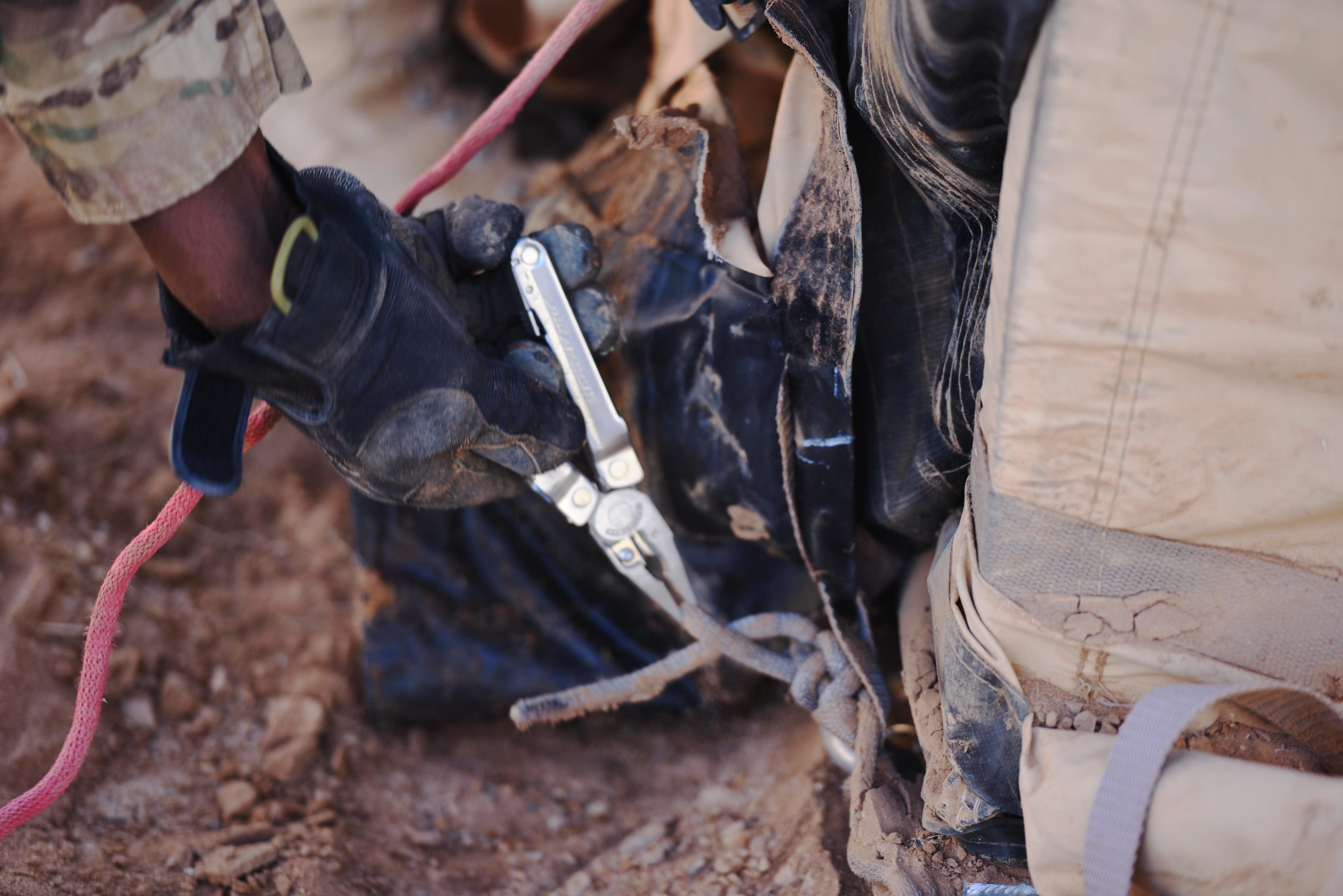 An Airman from the 724th Expeditionary Air Base Squadron takes apart rope tying down tents at the old base to move to a new location, Sept. 11, 2017, at Air Base 201, Agadez, Niger. The move to the bigger base is called “FLEXIT,” short for "Flintlock Exit.” Being located in this deployed environment requires temporary housing in lieu of traditional infrastructure. (U.S. Air Force photo by Staff Sgt. Joshua R. M. Dewberry/released)