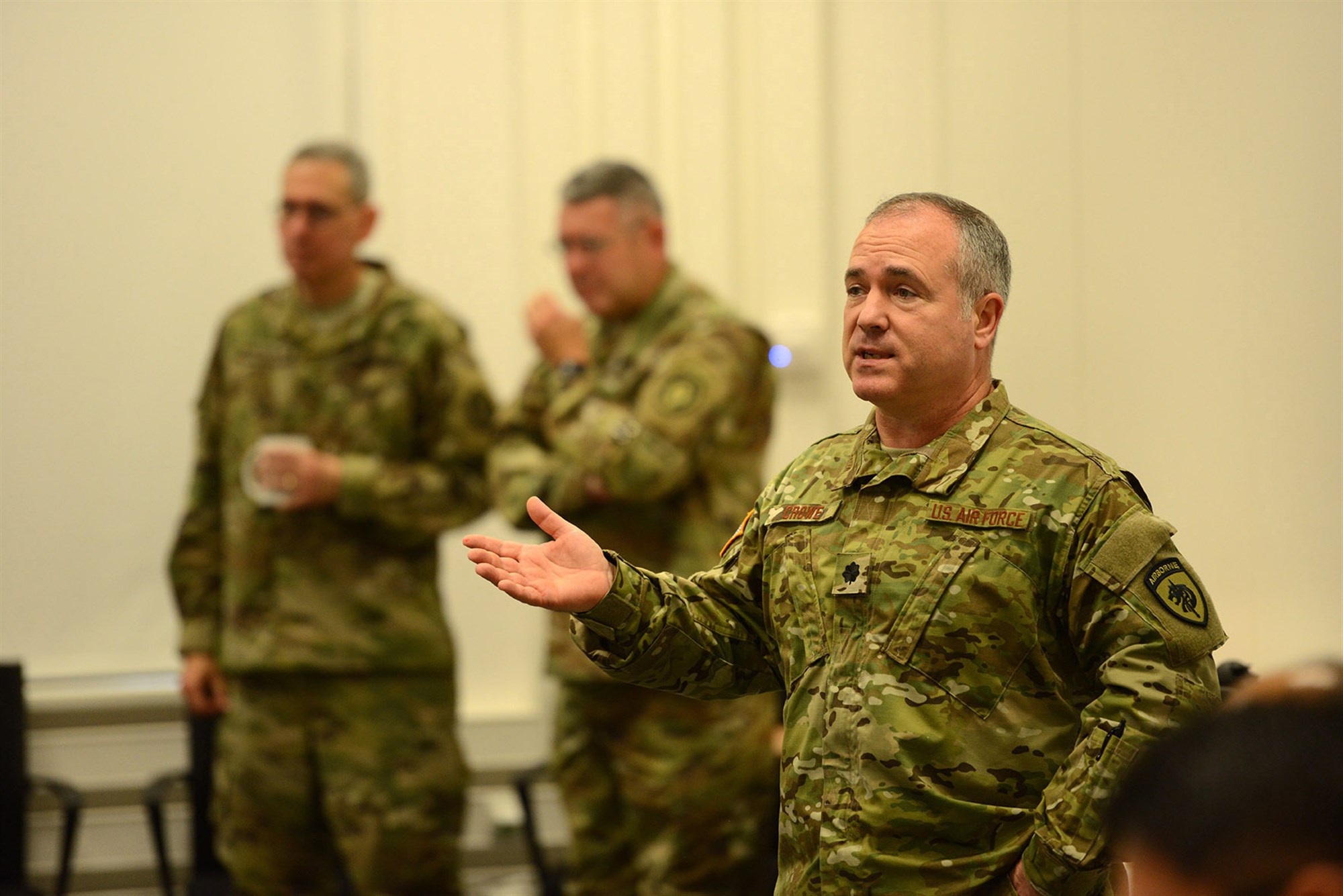 STUTTGART, Germany (Aug. 24, 2016) -- U.S. Air Force Lt. Col. John Crowe, U.S. Special Operations Command Africa's deputy surgeon, addresses participants during the U.S. Africa Command's Surgeon's Conference on Aug. 24. Entitled "Strength Through Health," the conference allowed participants to discuss ways to leverage capabilities of all partners, including international and interagency, on the African continent to deliver health services to U.S. and combined forces. (Official Dept. of Defense photo by Jason D. Johnston/RELEASED)