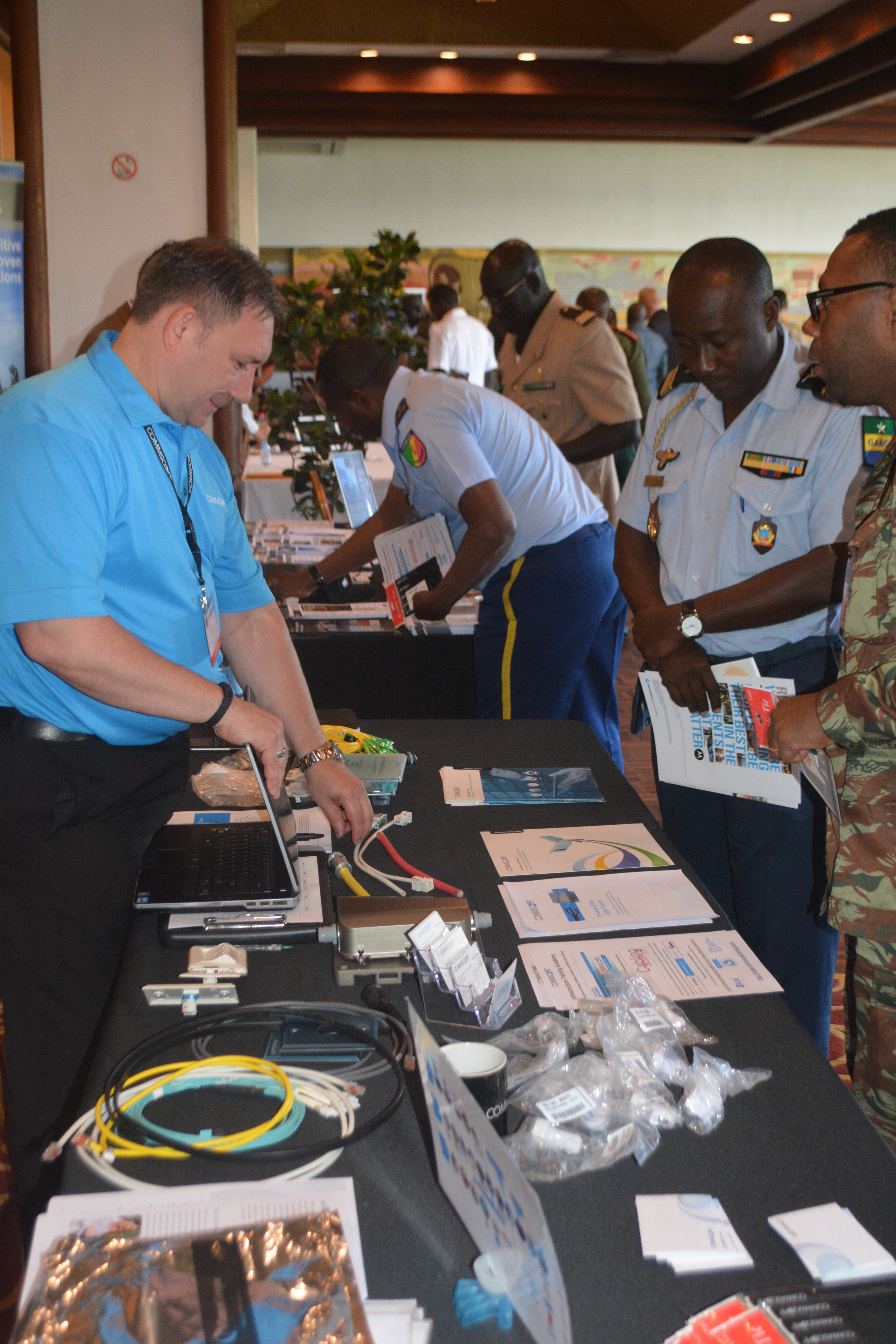 Africa Endeavor 16 participants listen to a technology expo representative talk about various Command, Control, Communications and Computer Systems (C4) solutions 18 Aug., 2016. AE16 is an annual U.S. Africa Command sponsored training and information sharing effort to help develop African multi-national communication interoperability for African Union and United Nations mandated peacekeeping and disaster response in Africa. Over 40 African nations participated in this year's events