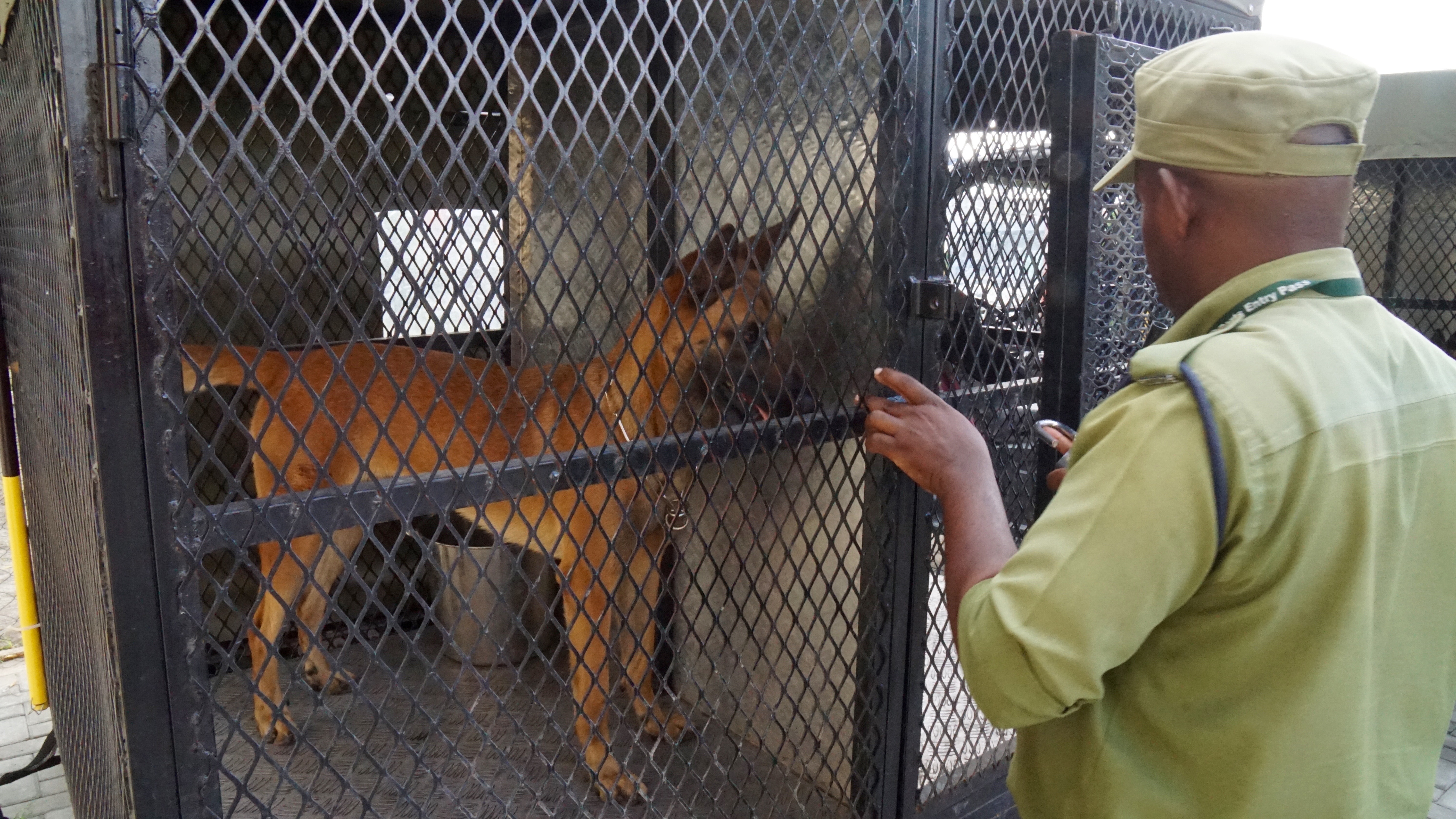 A Tanzanian canine handler opens the transport cage to retrieve his partner for the day's work at Dar Es Salaam, Tanzania, March 2, 2016. (U.S. Customs and Border Protection photo by Timothy Ryan/Released)