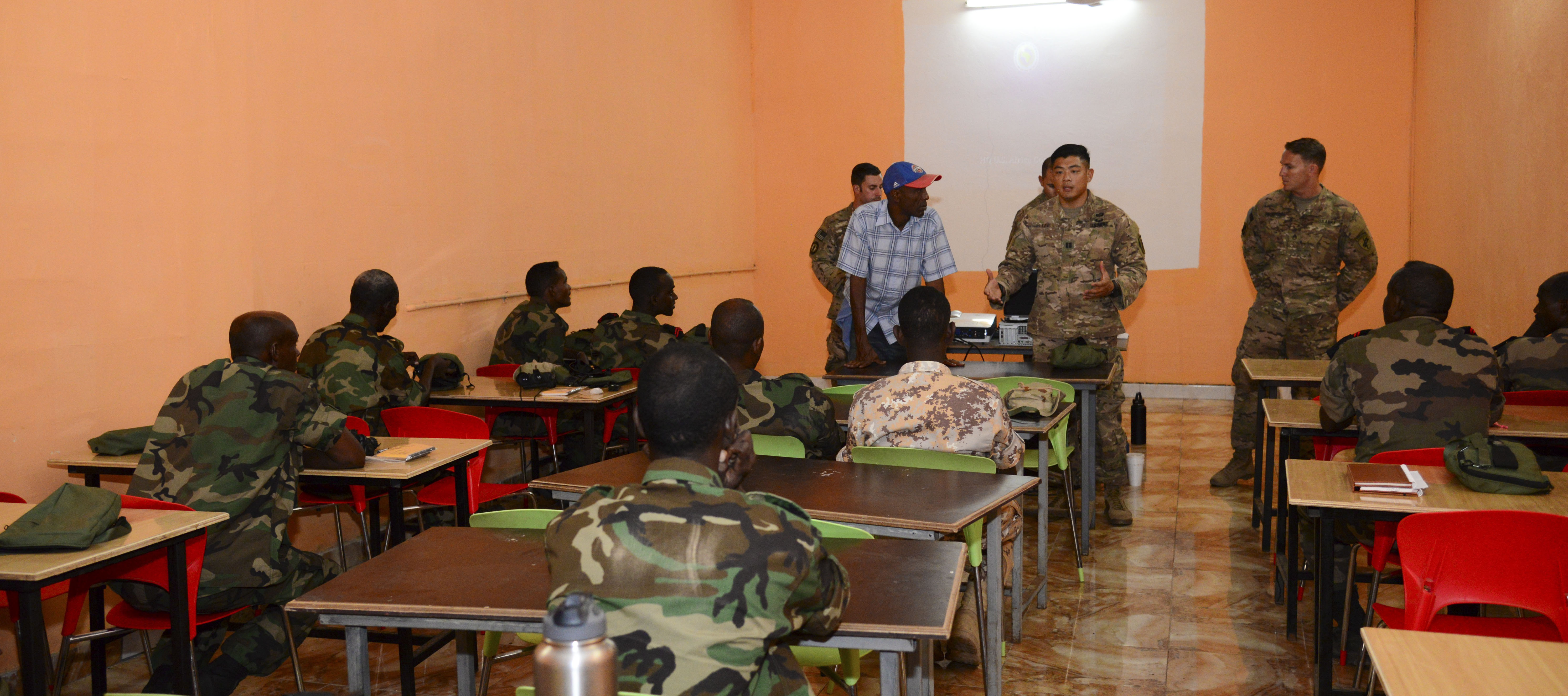 U.S. Army Spc. Dillin Hart, a Combined Joint Task Force-Horn of Africa technician on the Africa Data Sharing Network (ADSN) system, reviews network configurations with members of the Djibouti Armed Forces (FAD) during training validation Sept. 28, 2016, at FAD Headquarters in Djibouti. While conducting the best practices training, the U.S. Army technicians assigned to Combined Joint Task-Horn of Africa, also held an ADSN validation with the FAD soldiers to prepare them to deploy to Somalia. The ADSN provides network and Voice over Internet Protocol capabilities between the several African countries participating in the Africa Union Mission in Somalia. (U.S. Air Force photo by Staff Sgt. Eric Summers Jr./Released)